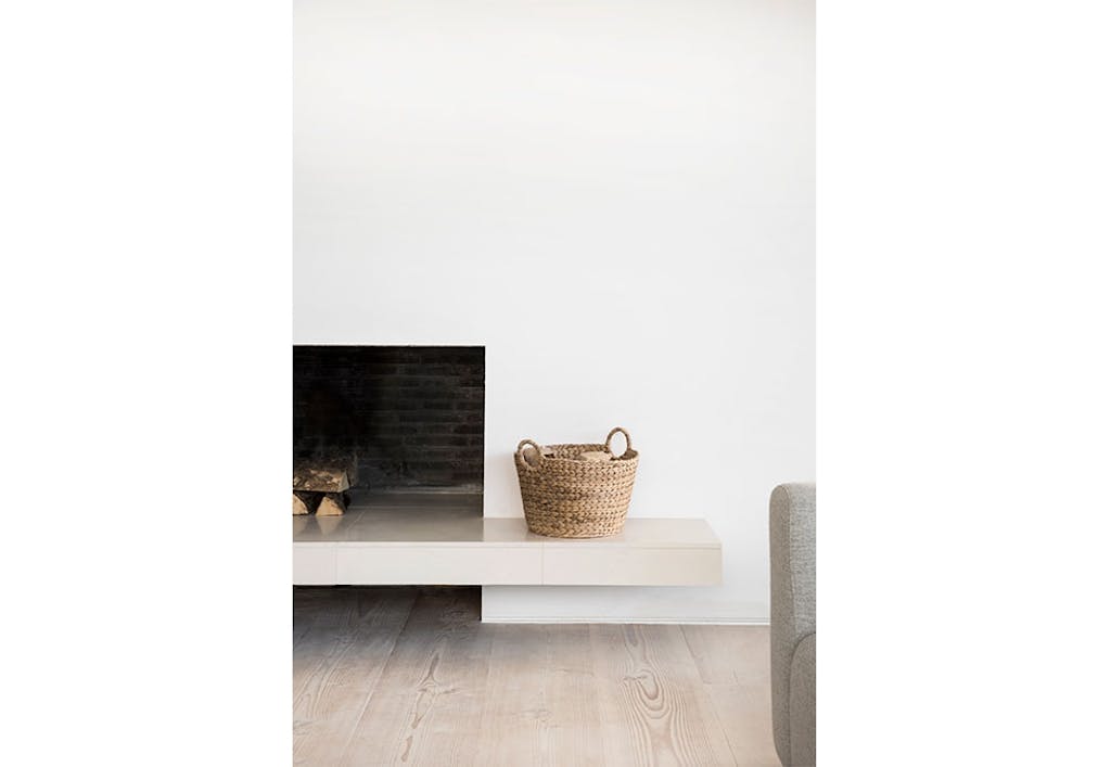 Til tross for at boligen ligger rett nord for London, har den adoptert det typisk skandinaviske, både i farger (eller mangel av) og design. Kritthvite vegger og lyse gulv er blanke lerret for dagslyset som trenger gjennom vinduene, kun dempet av florlette gardiner. Møbleringen er enkel og i all hovedsak fra danske &Tradition og Menu – to søsterselskap som Norm Architects også designer mye for. Peisveggen fungerer som en skillevegg mot kjøkkenet.