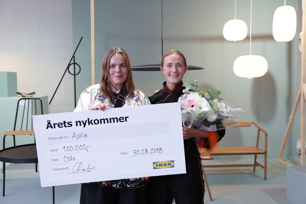 Til stormende applaus gikk Marie Sagen og Sara Gretteberg opp for å motta Aulas pris – noe overveldet. I tillegg til tittelen årets nykommer, mottok duoen også 100 000 kr i premie fra Ikea!