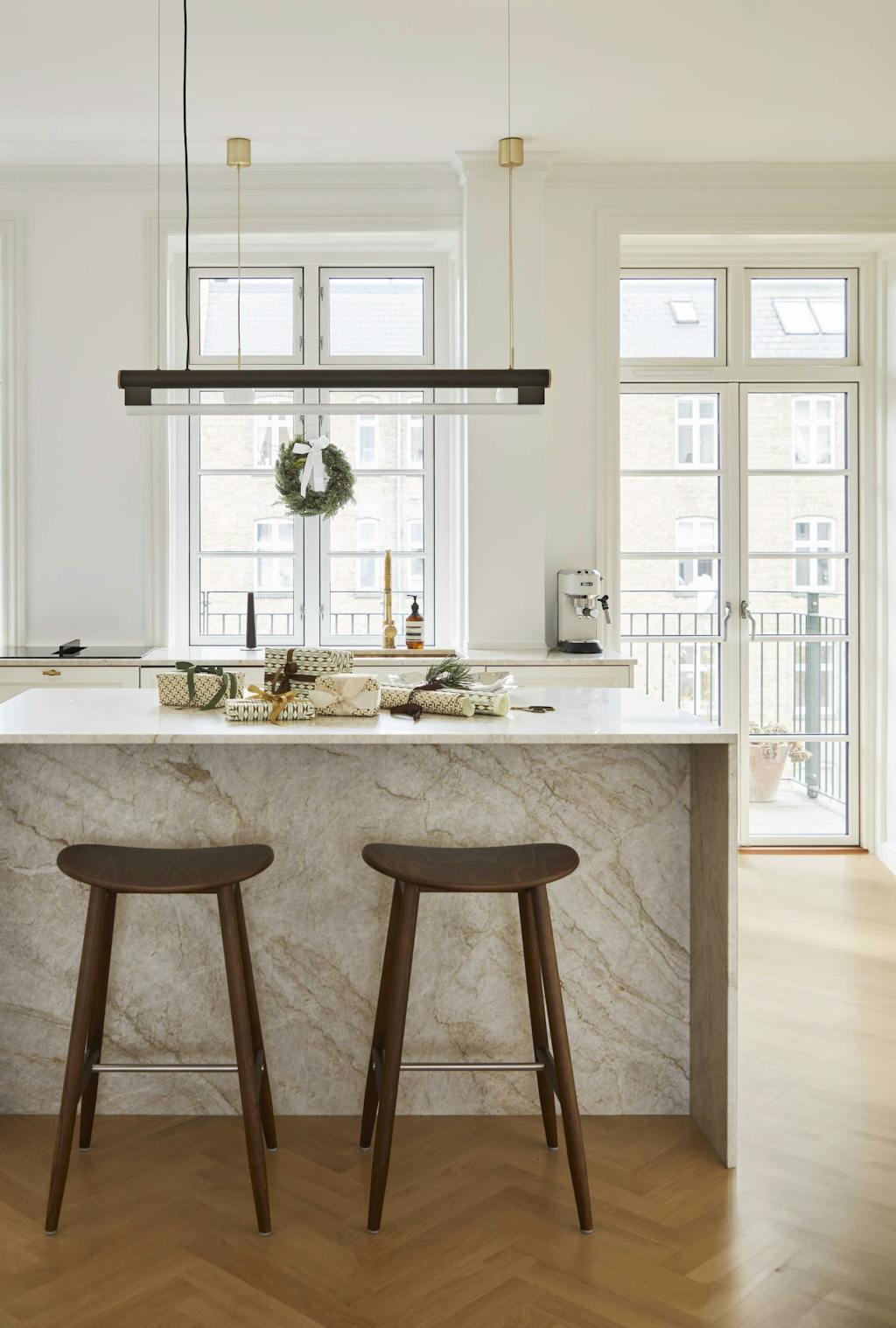 Alexandra pakker inn gavene slik at de får et enhetlig og harmonisk uttrykk. Barstolene ved kjøkkenøya er fra Massproductions, og lampen over fra Frama.
