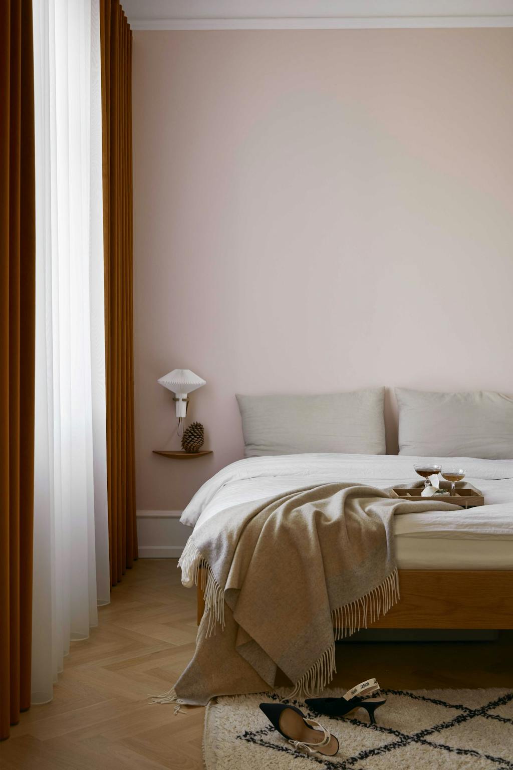 Også sengen er bygget til rommet, og akkurat som leselampen med brettet papirskjerm, tilfører den noe japansk og skaper en harmonisk sammenheng i rommet. Konglen er rustikk og stemningsfull julepynt. Sengetøyet er fra Georg Jensen Damask, og kasjmirpleddet fra Nordic Weaving. Lampen er The Mushroom fra Le Klint, nattbordet er fra Audo Copenhagen, mens brettet er fra Blomus. Glassene er vintage, og gardinene er fra &Drape.