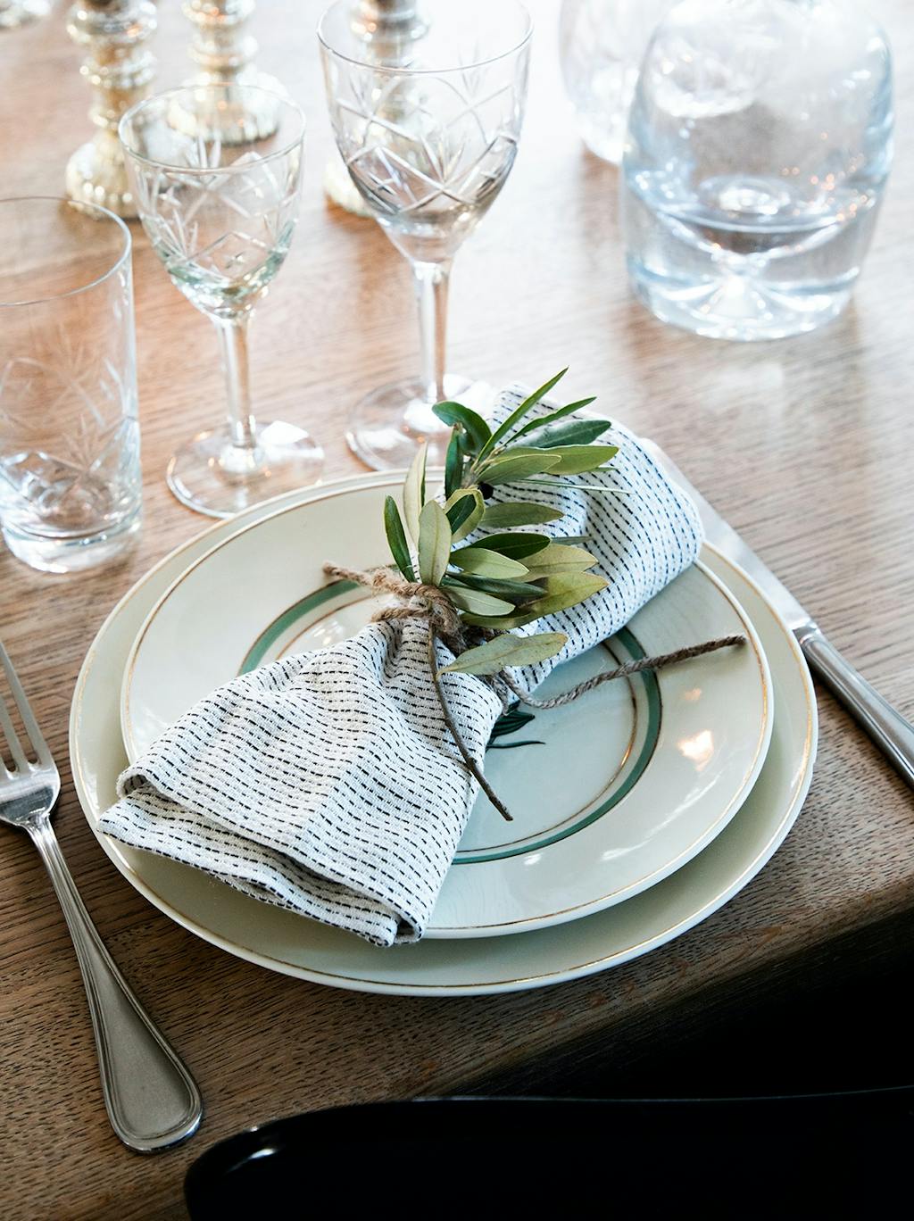 Serviset har Marie-Louise arvet fra sin farmor, så det har stor sentimental verdi for familien. Kombinert med nydelige krystallglass, nypusset sølvbestikk, fine linservietter og en liten olivenkvist på hver kuvert får det jordnære dekketøyet en eksklusiv høytidsstemning.