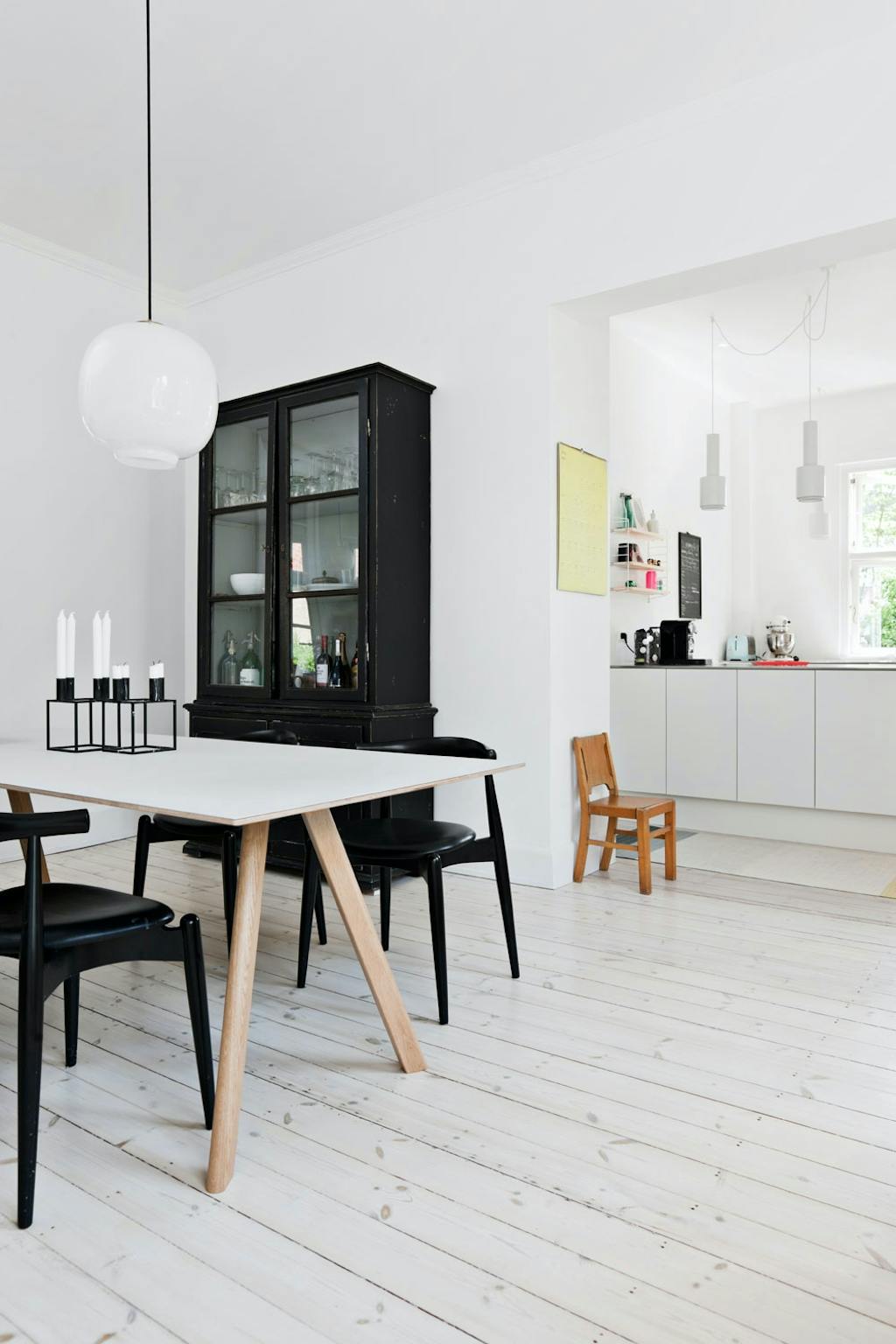Over spisebordet henger Vilhelm Lauritzens Radiohus-pendel, som Lise har arvet fra den gamle barneskolen sin. Kubus-lysestakene plukker opp formen fra de klassiske vinduene, og gir rommet et helhetlig uttrykk. Spisebordet er fra Hay, mens CH20-stolene av Hans J. Wegner er fra Carl Hansen & Søn.