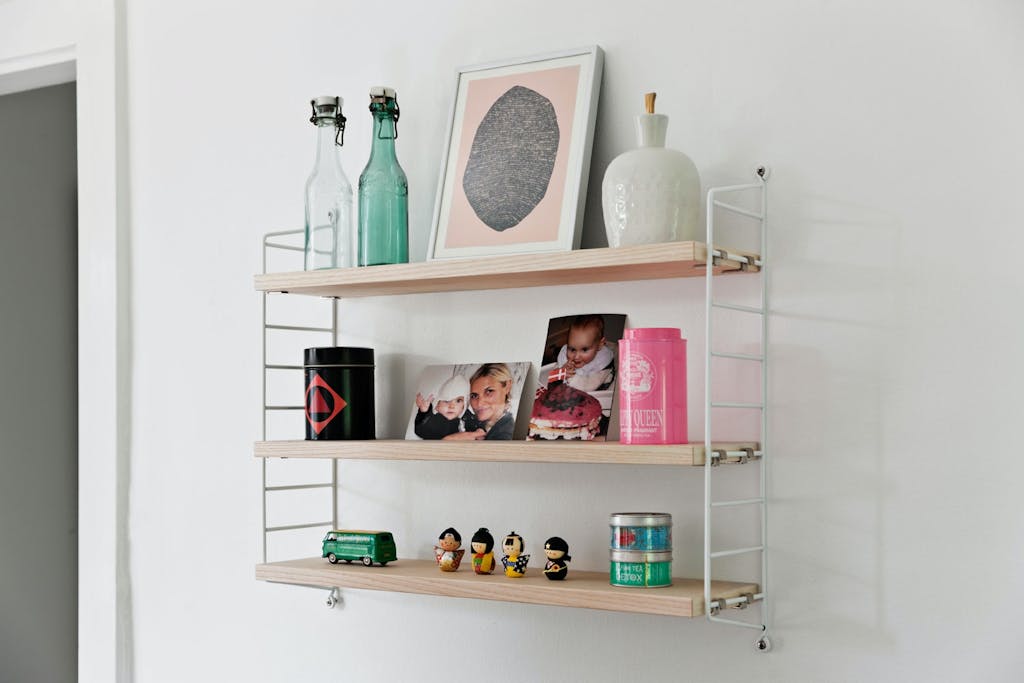 String-hyllen med familiefoto og små suvenirer myker opp det ellers stramme interiøret.