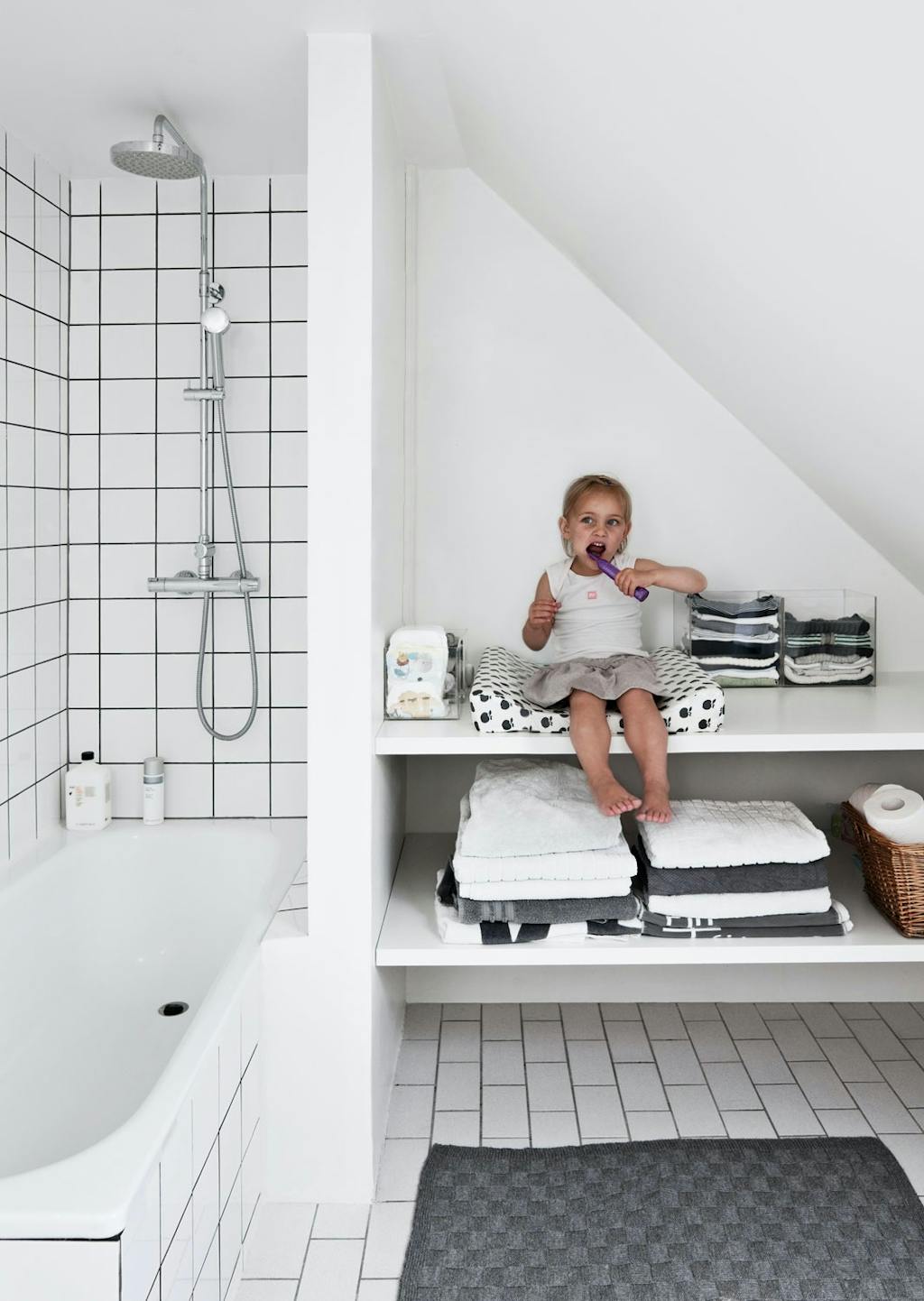 På badet er det montert hyller til stellebord og oppbevaring – og tannpusskrok til Norma.