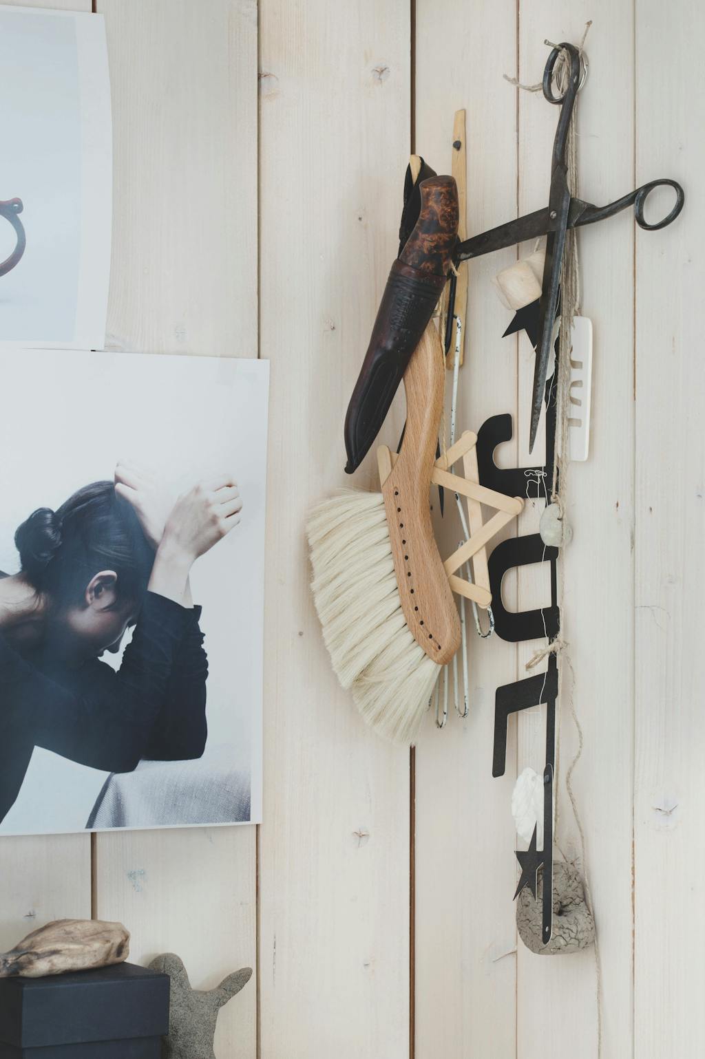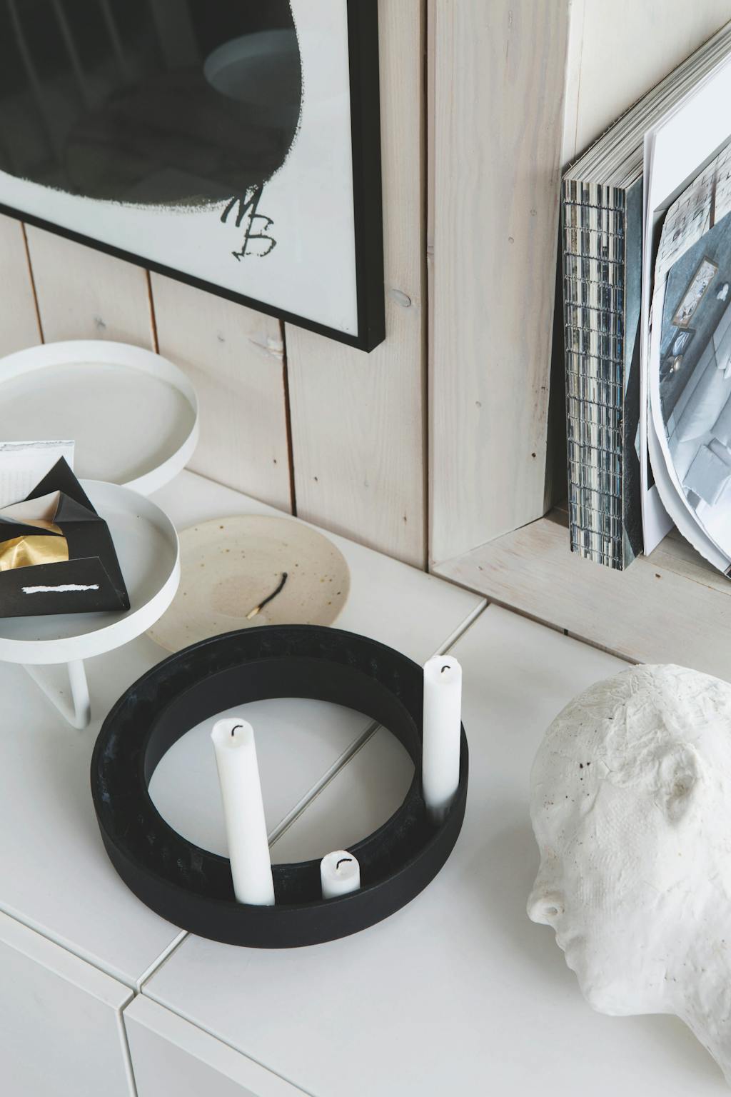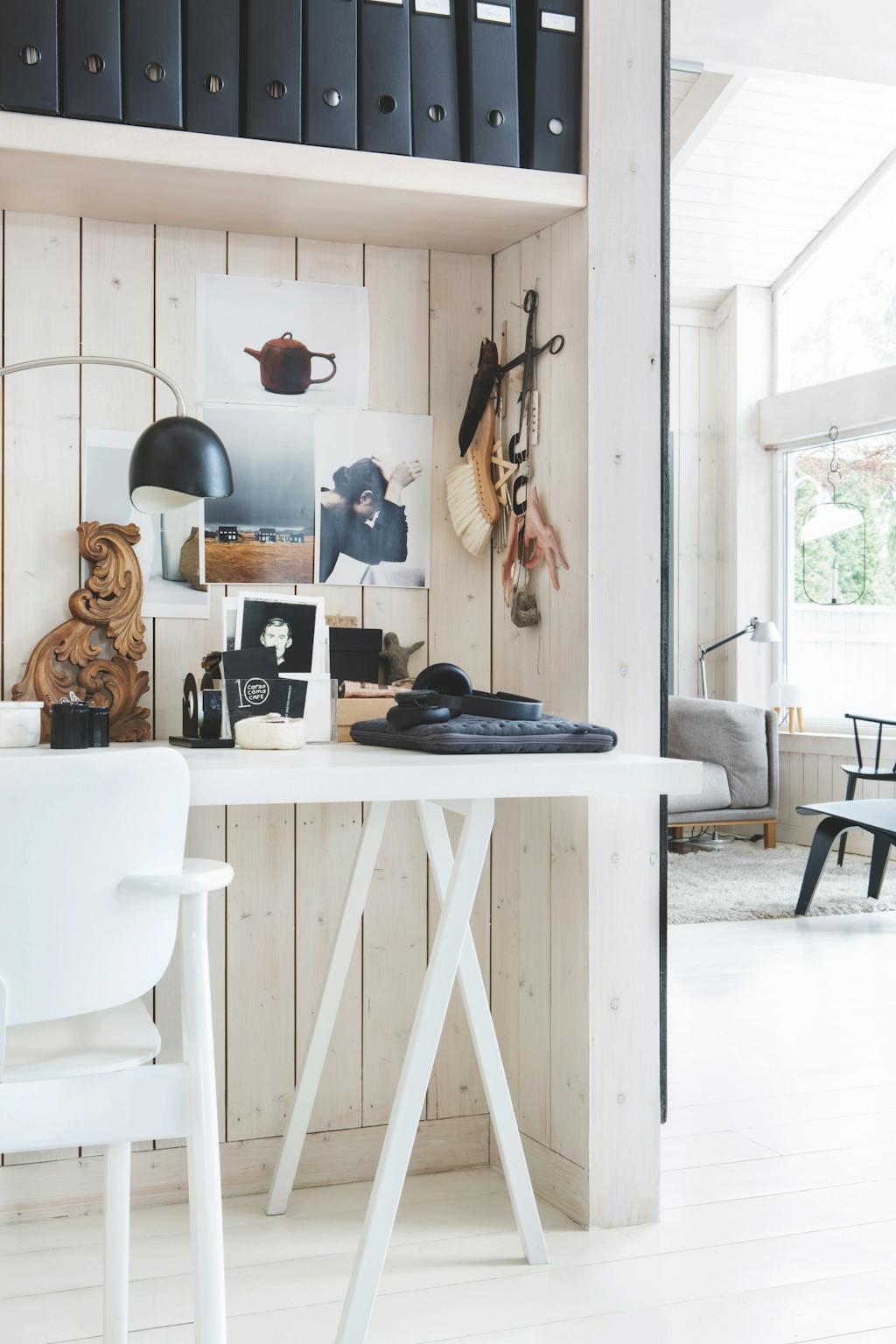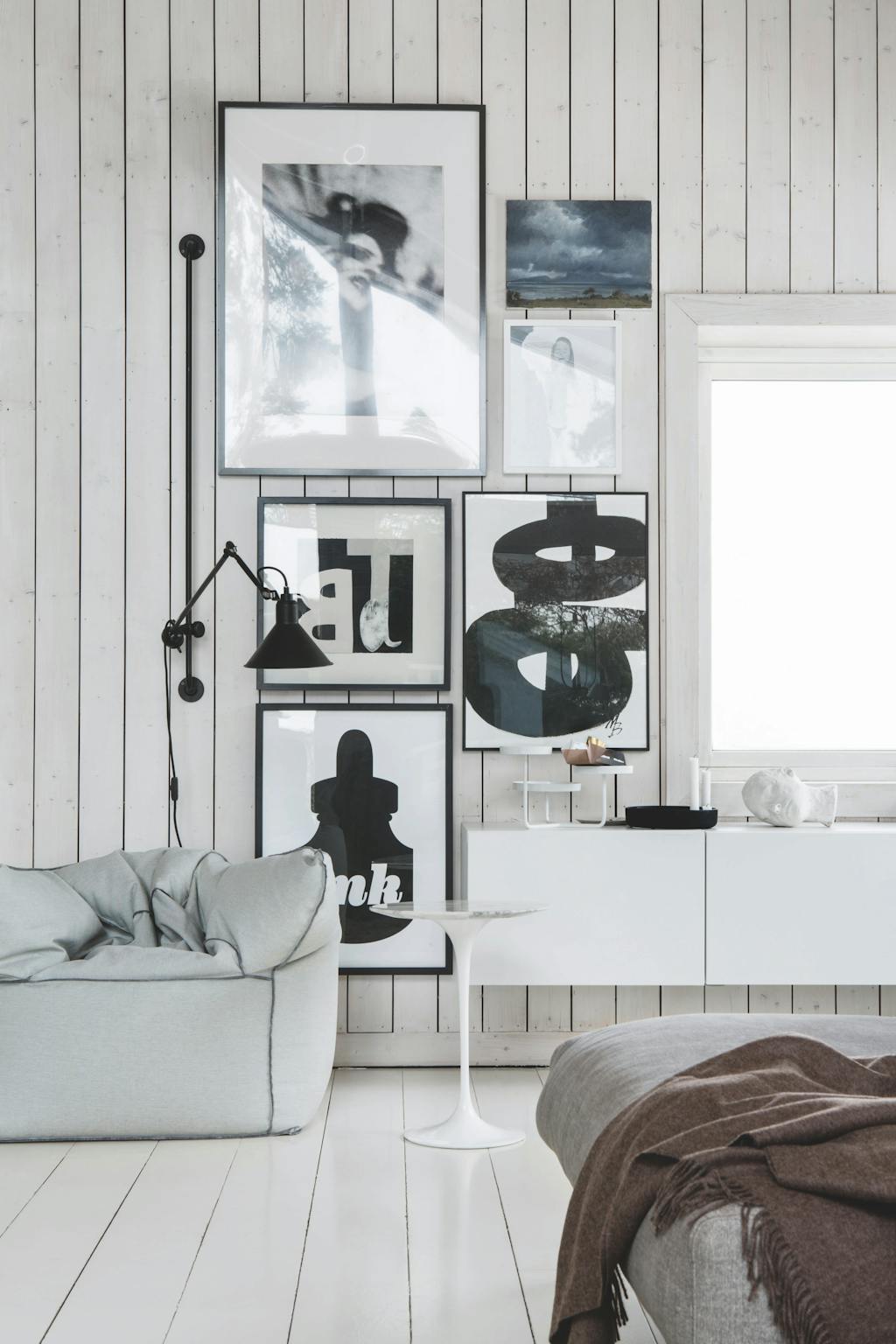 Kirsten foretrekker den skandinaviske fargepaletten av lyst treverk, jordtoner og brente nyanser, og bruker mye tekstiler og naturgarvede saueskinn som luner. For å stramme det opp og gi interiøret modernitet, bruker hun svarte detaljer. Bildene er en miks av Margaret M. de Lange, Magne Furuholmen, Christopher Rådlund, Malene Birger og sønnen Gard. Vegglampen er fra Lampe Gras og sidebordet fra Knoll.
