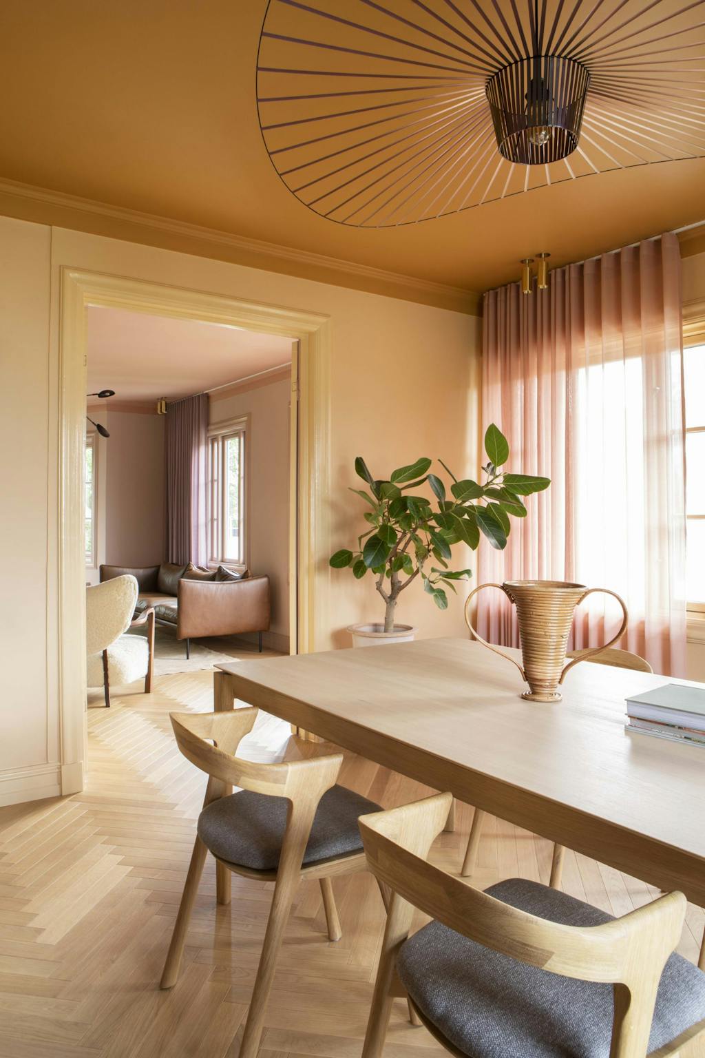 – I en spisestue der man skal sitte i mange timer, bør det være varmt og levende, tenkte vi. Så det ble gult der. Men i tv-stuen ville vi ha en mer dempet stemning, så der gikk vi for noe mørkere.