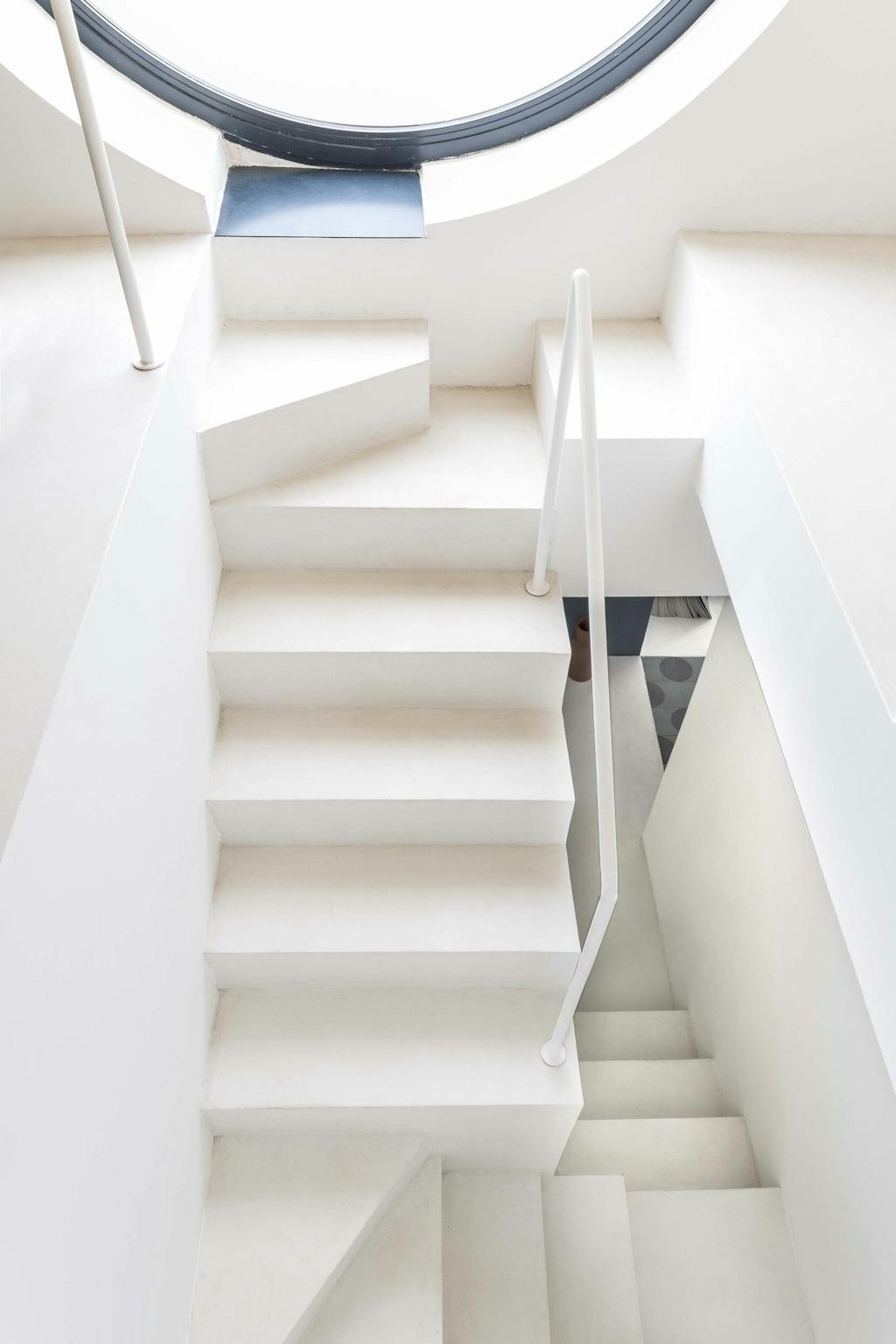 – Et hus skal gi deg en følelse allerede før du går inn. Og her går du fra trappen ute opp til den buede inngangsdøren, inn i stuen, og deretter tar den hvite trappen deg opp til andre etasje. Her kan du nyte utsikten gjennom det store vinduet eller gå ut på terrassen for å slappe av og lytte til brisen fra havet. Leideren, husets siste trapp, er den minste og mest skipsaktige, og slanke blå jerntrinn tar deg opp på taket. Det er opplevelsen av dette huset – trappene av forskjellige materialer, lyset, høyden, rommene – før du til slutt når toppen og ser havutsikten.