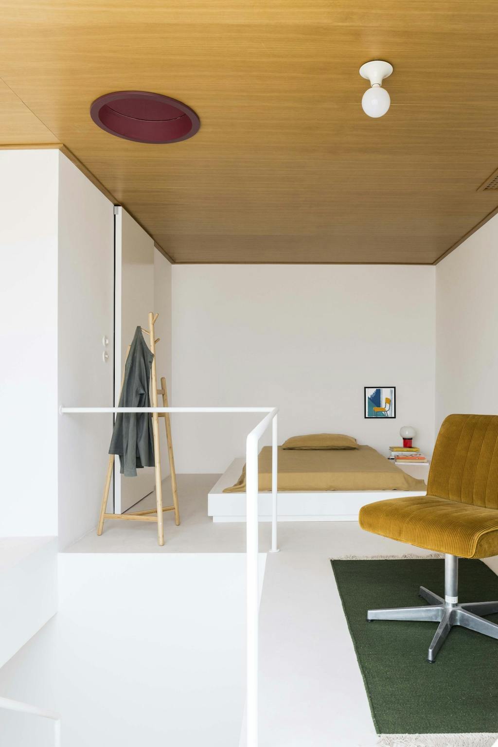Oppholdsrommet er både stue og spisestue, og derfra er det ett trinn opp til kjøkkenet. Mellom stuen og kjøkkenet er det en enkel, hvit trapp som tar deg opp til andre etasje og soverommet med det runde vinduet, et lite bad og en stor terrasse.