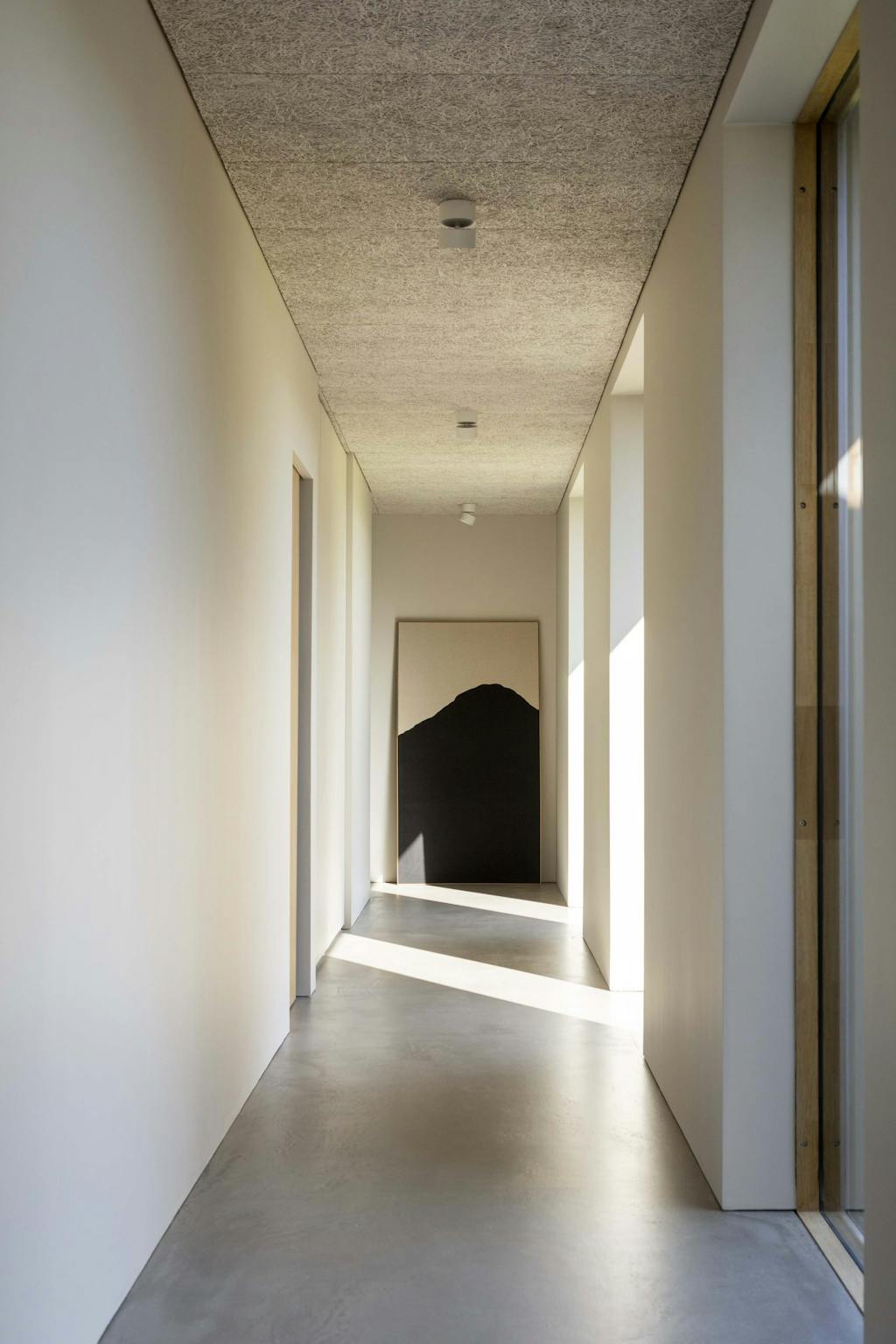 I den andre enden av stuen strekker en spesialbygget hylleseksjon med skjult oppbevaring seg fra gulv til tak, og gulvet i glatt flytbetong komplementerer det varme treverket og det lydabsorberende taket i treullsement. Lenestolen er fra Zara Home, mens sidebordet og lampen i tre er designet av Vilde Hagelund. Den skulpturelle lysestaken i støpejern, Nunatak, er fra Nedre Foss.