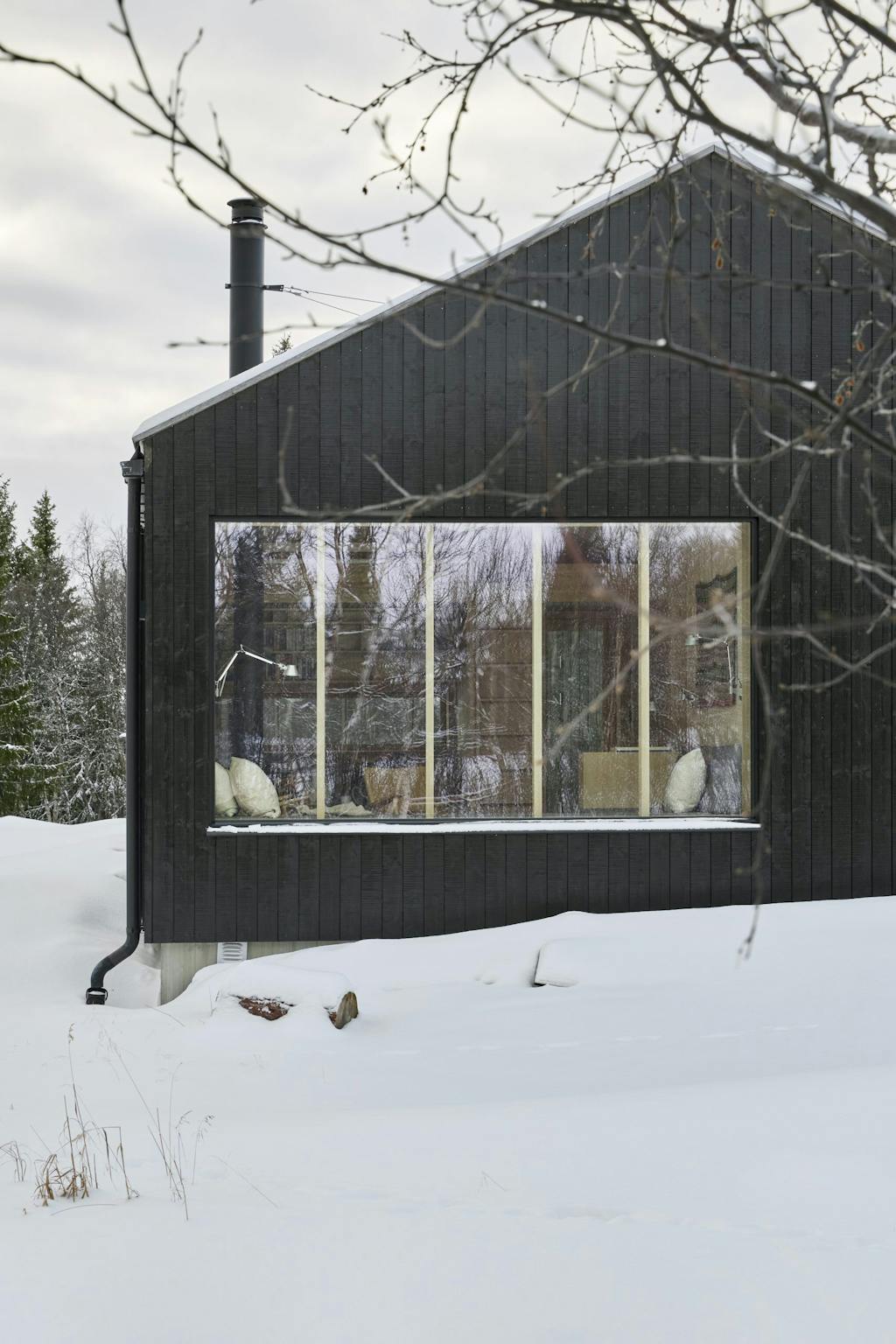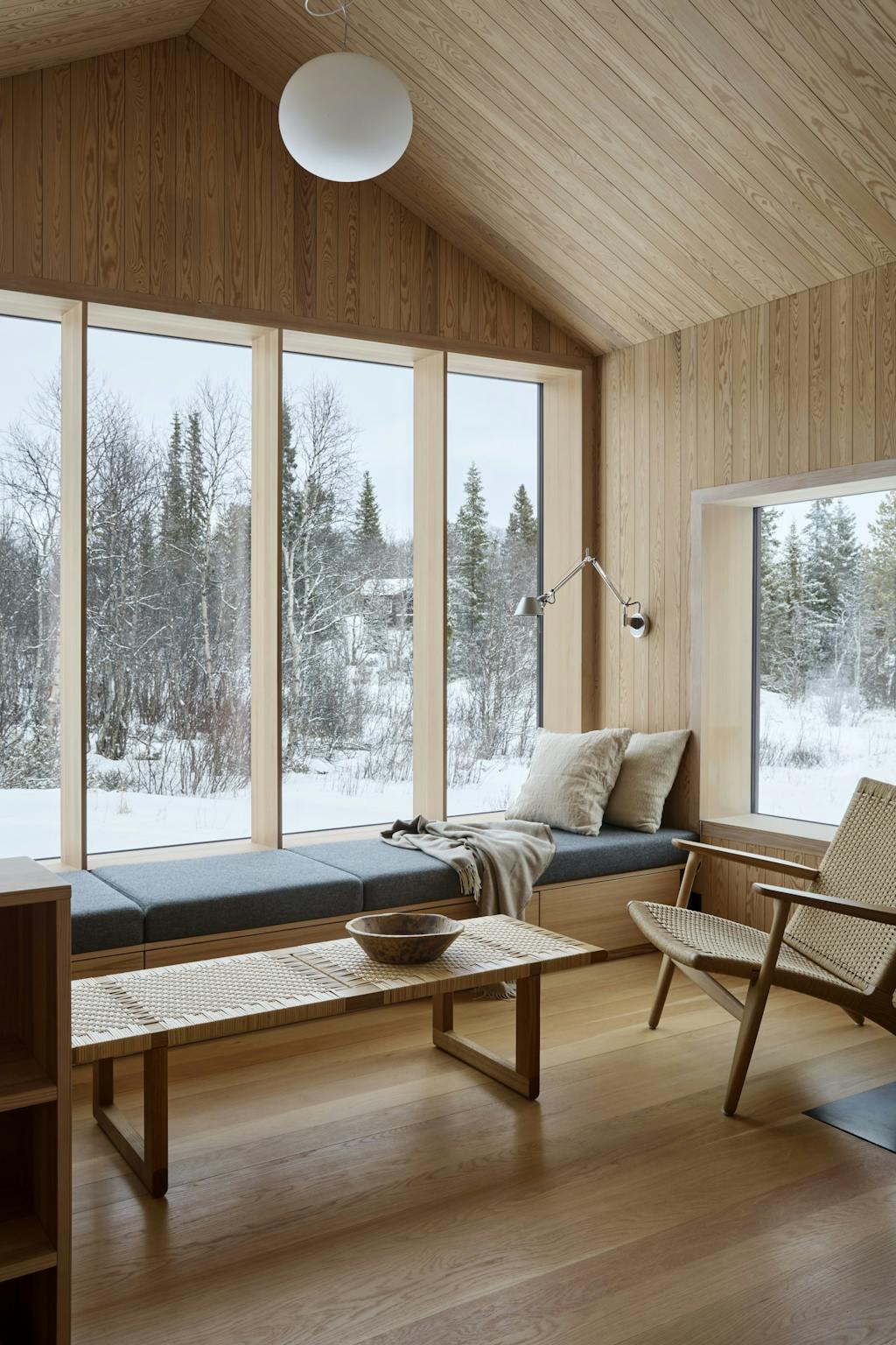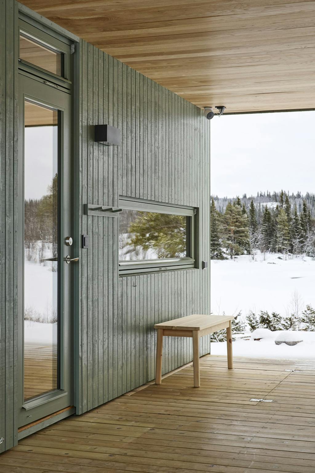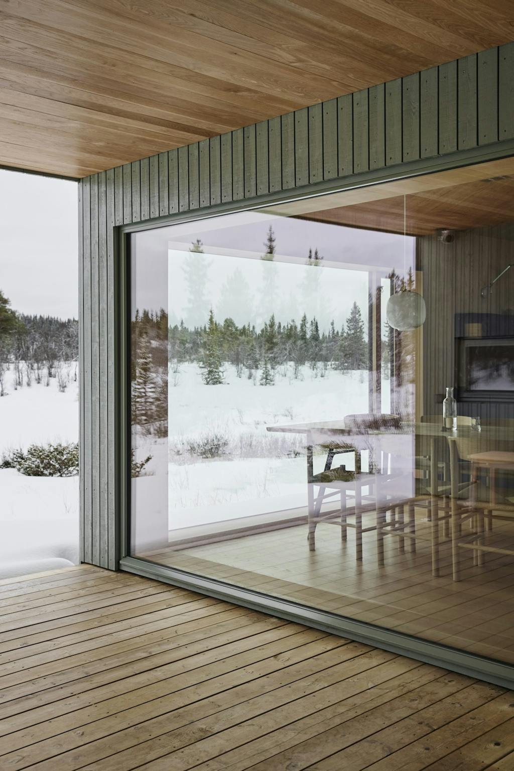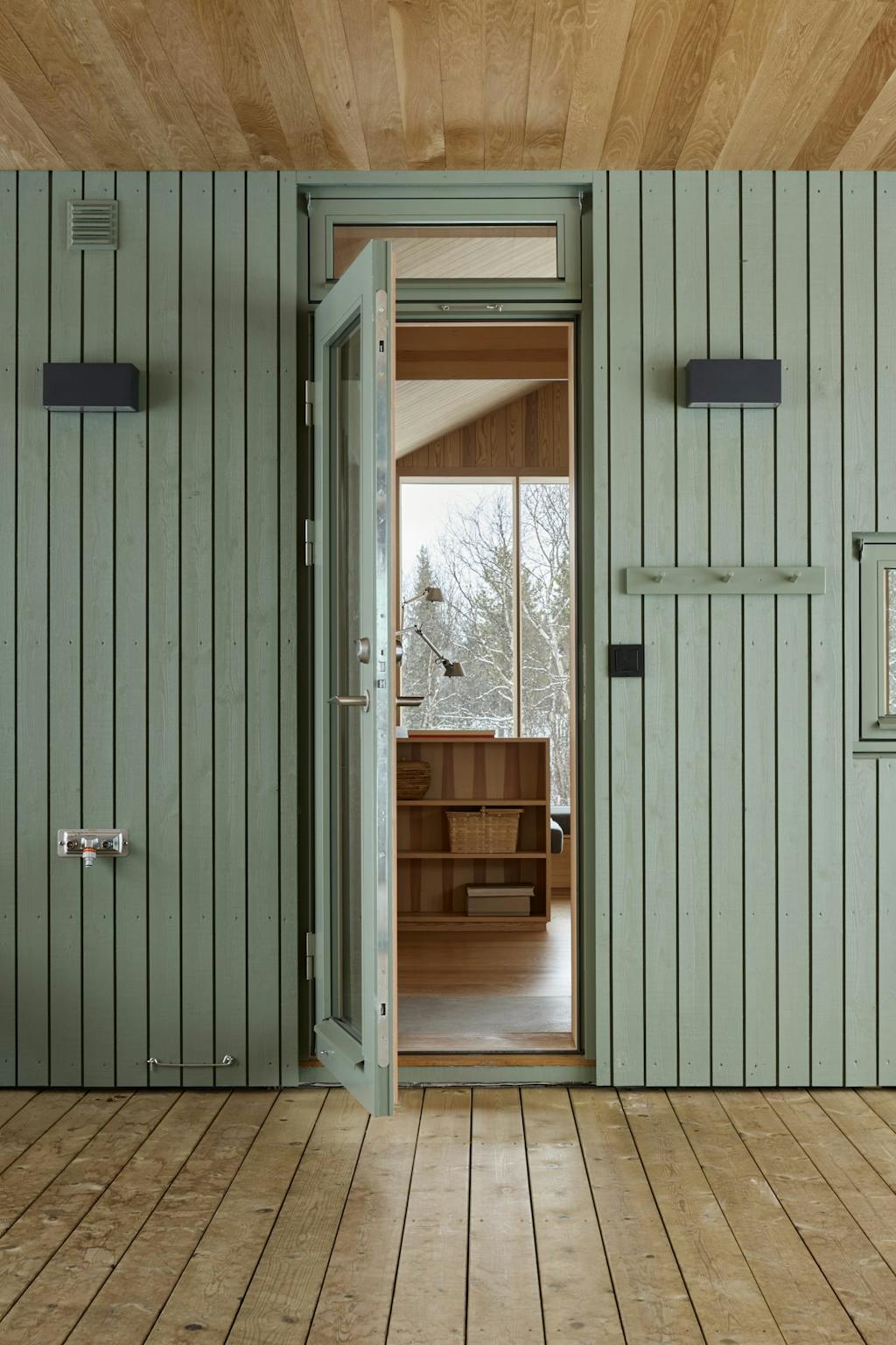 På den måten har arkitekten skapt god flyt gjennom bygget – og man har fått utsikt fra kjøkken og spiseplass ned mot vannet, fra stuen mot Skogshorn og fra annekset og badstuen ut i bjørkeskogen. Passasjene kan lukkes med fire store skyveporter som gir fleksibilitet, en lunere følelse og beskyttelse mot snøføyk.