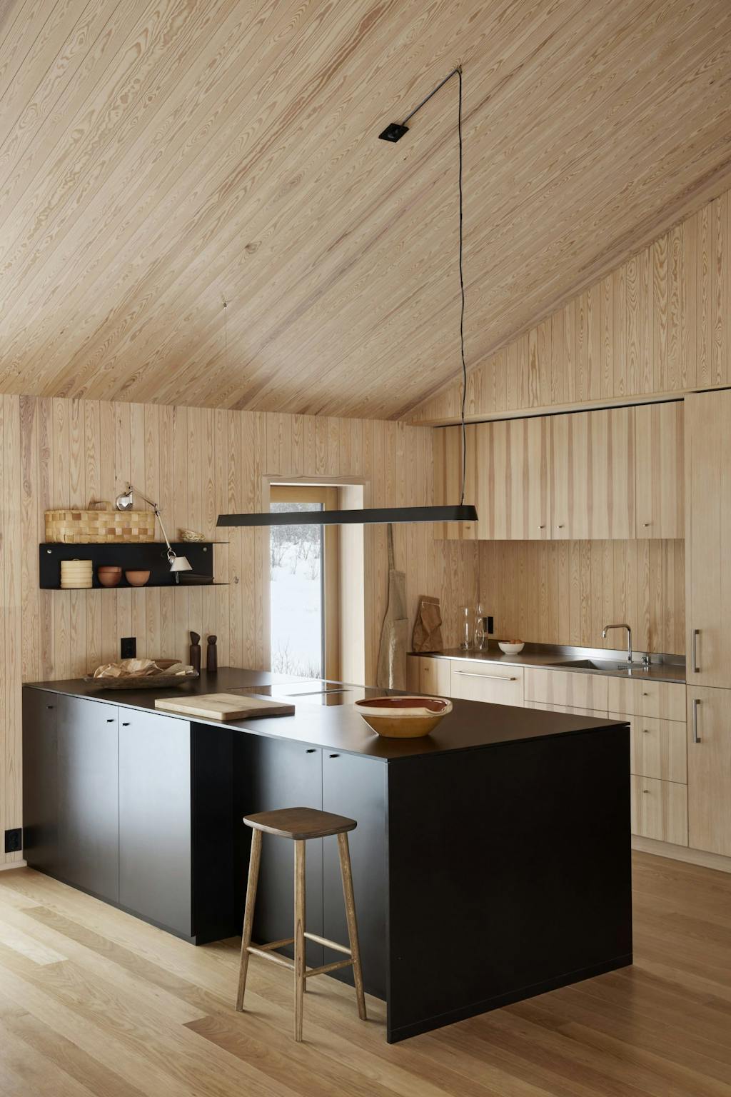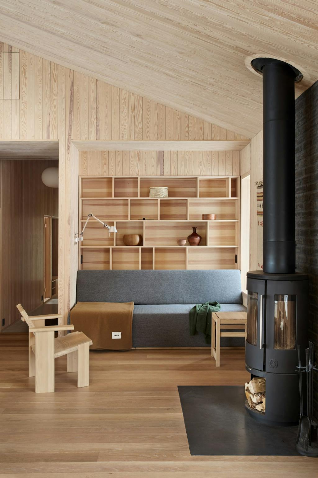 Ildstedene med mørk tegl bryter opp den lyse paletten, og den svarte kjøkkenøya skaper en moderne kontrast. Det er valgt vannbåren varme i alle de innvendige gulvene. Badstuen er kledd i ospespiler, som tåler temperatursvingninger godt og er behagelig å sitte på.