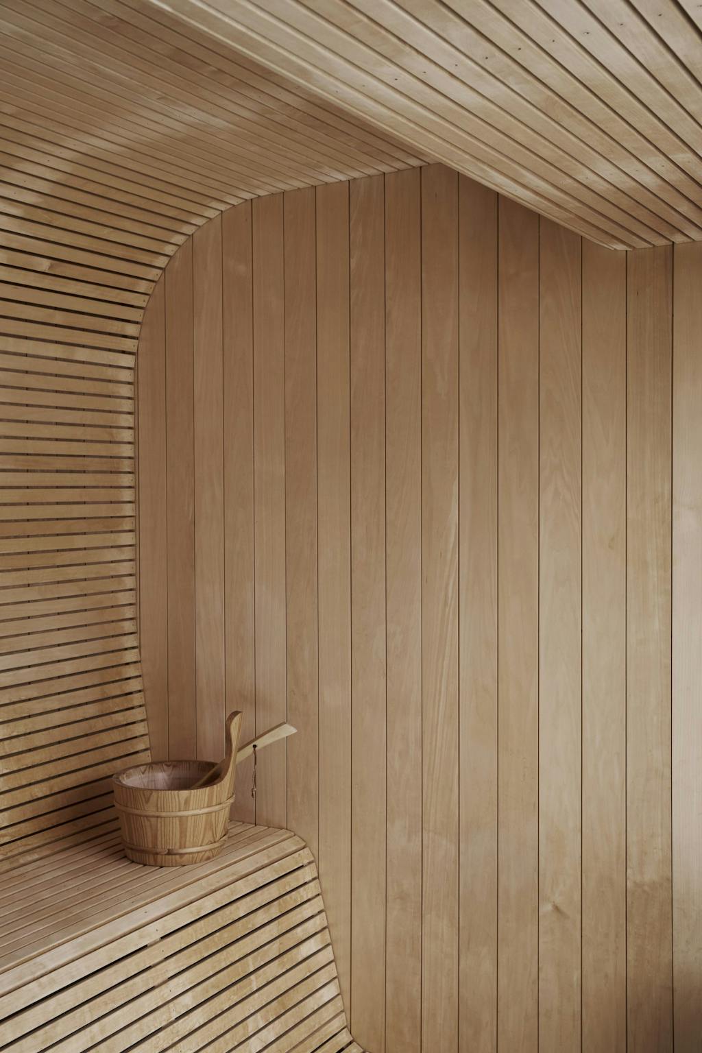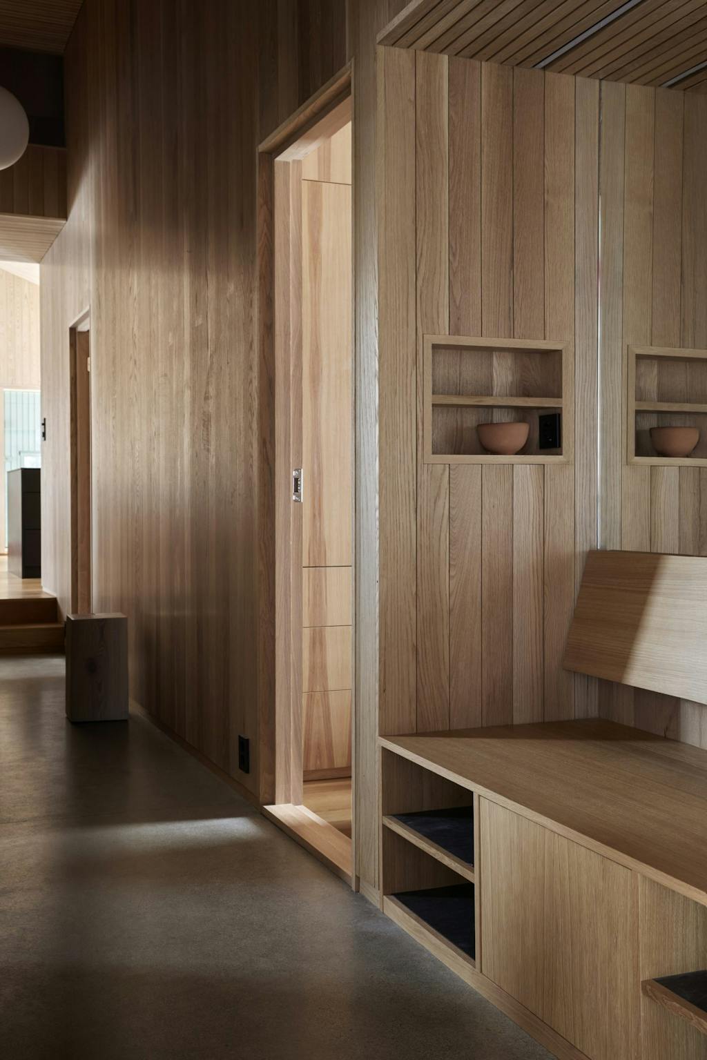 De to passasjene har lindegrønne vegger og himling i eik. Interiøret har kvistfri furu på veggene, mens gulvene er av eik og betong.