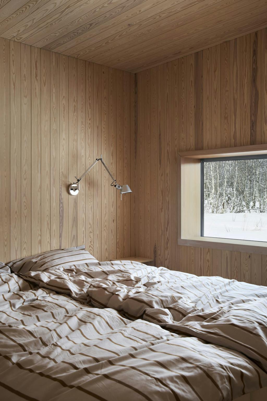 – Derfor ble det viktig å skape kontakt med vannet nedenfor – der skisporene går om vinteren og vannaktivitetene foregår om sommeren – og samtidig fange det stadig skiftende lyset over fjellet Skogshorn.