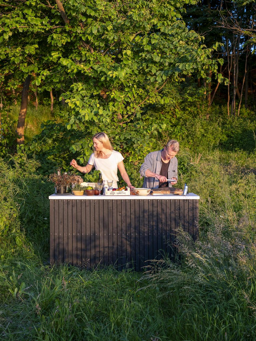 Spiseplassen ute er som skapt for middager under åpen himmel – gjerne med fisk Tine har fanget selv, og grønnsaker tilberedt i utekjøkkenet.