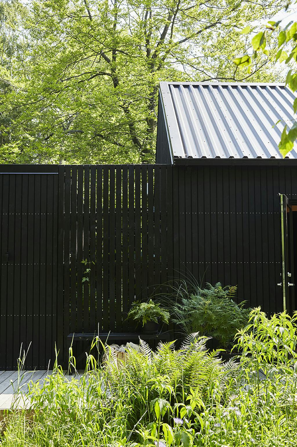 Fra spisebordet i den svartmalte hytta gir tre store glasspartier nesten hundre og åtti graders utsikt til hagen utenfor.