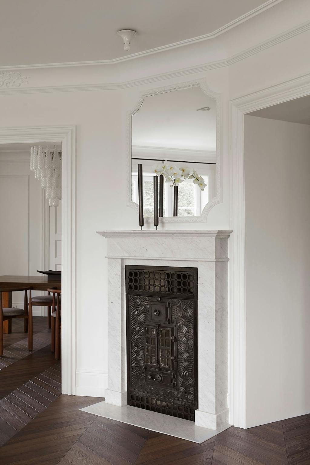 Flisene i entreen er fra Ulfven, bordet er fra Dusty Deco og vasen er fra Moniker. Gulvet er et parkettgulv i eik fra Unikt Gulv. Stolen er spesiallaget.