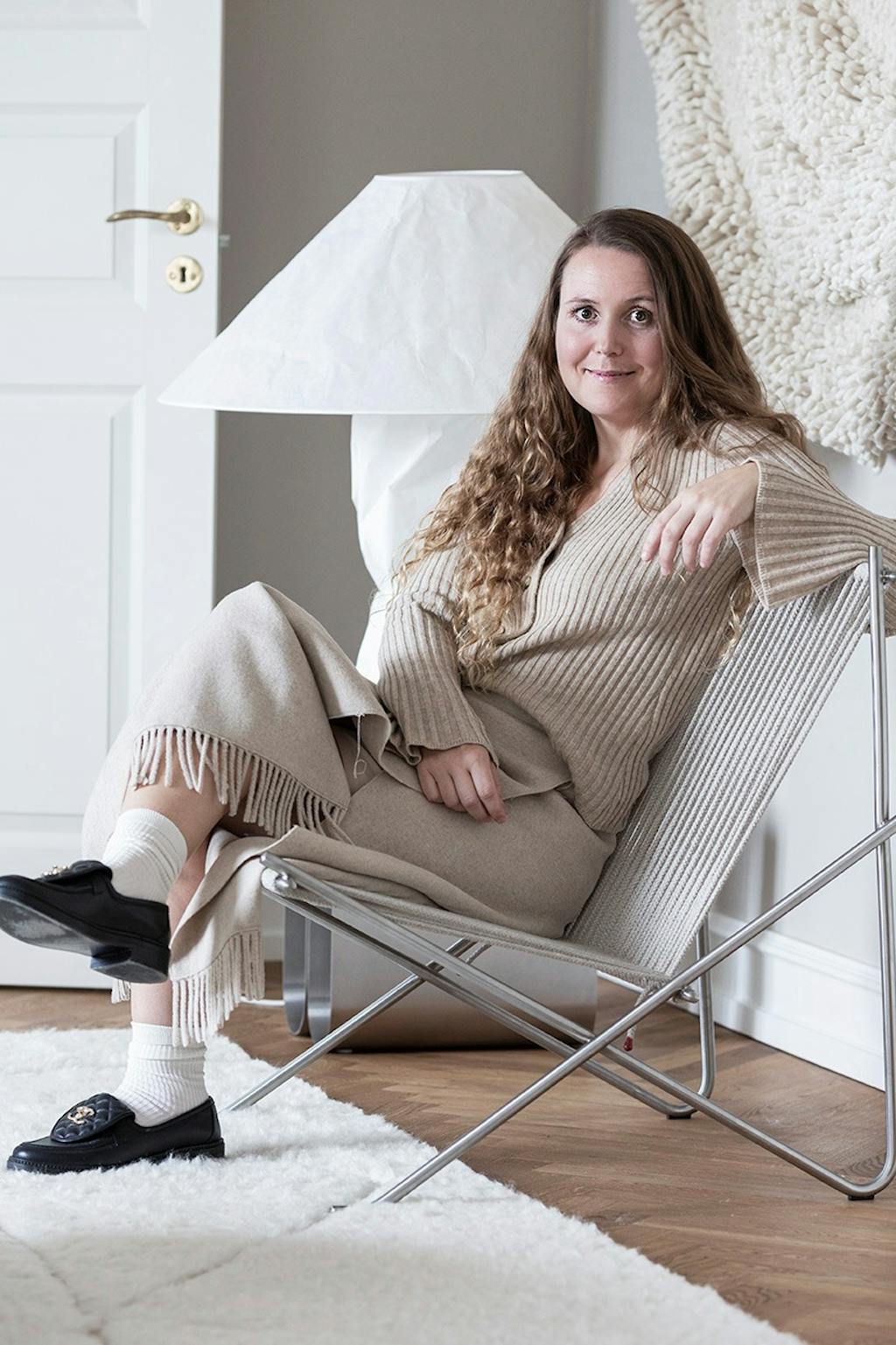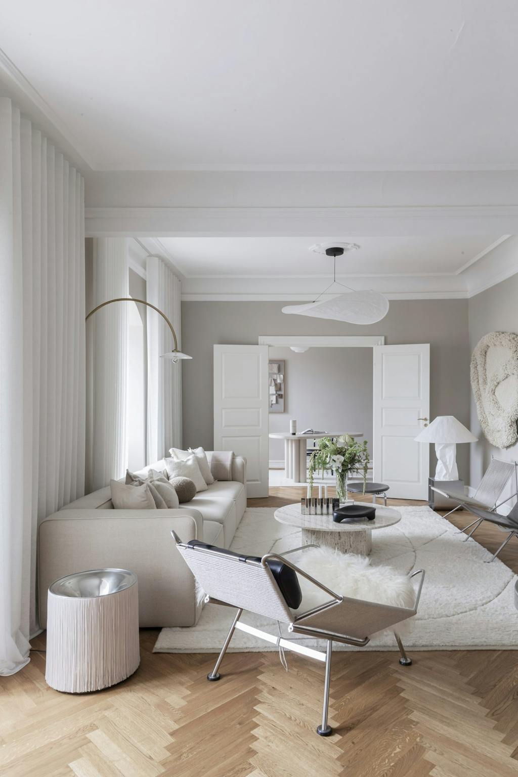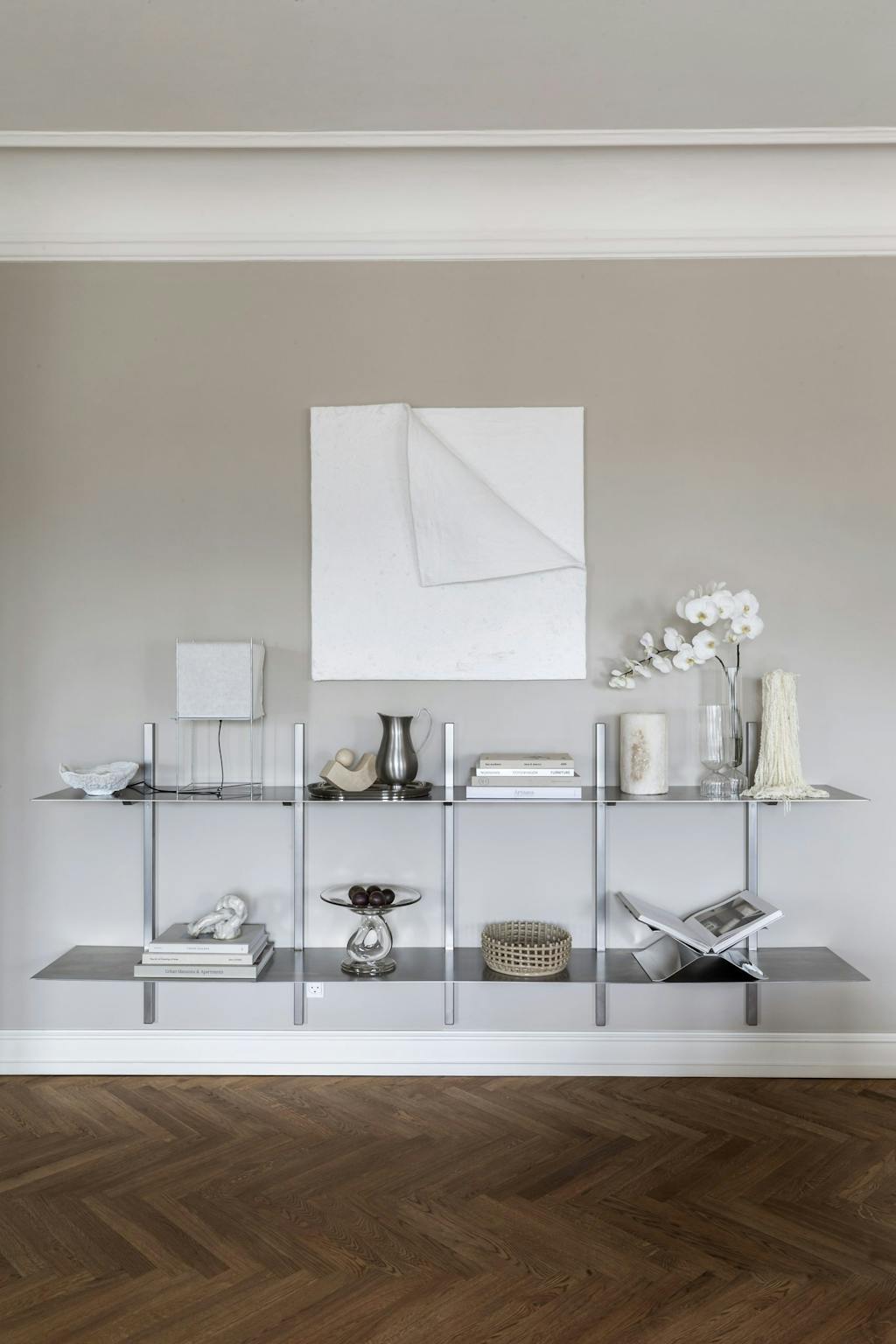 Når du lar blikket vandre gjennom leilighetens store, åpne rom, er det ikke tvil om at her bor det et par som setter håndverk, design og estetikk høyt. Den lyse leiligheten er innredet med vakre designklassikere, organiske skulpturer, myke tekstiler og masse stål – et moderne innslag i det ellers så nordiske uttrykket.