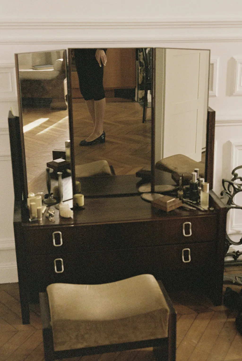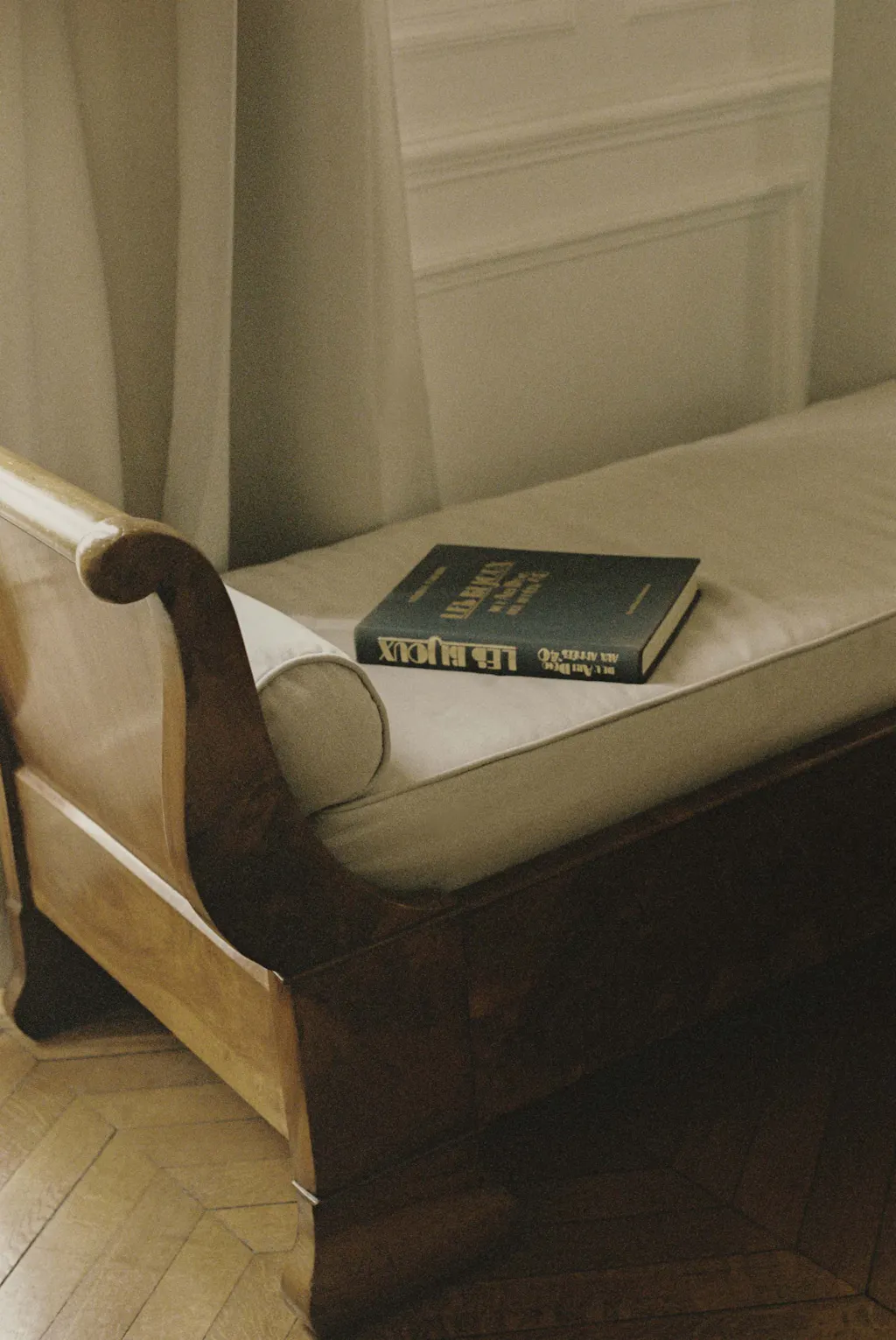 – Min andre favoritt er det store skapet med speil. Utrolig nok kostet det bare 500 kroner. Det skal sies at jeg kjørte fire timer utenfor Paris i en van for å hente det, men det er i fantastisk kvalitet og verdt utrolig mye mer. Dagsengen i stuen er jeg også blitt veldig glad i. Da jeg kjøpte den, hadde den et helt forferdelig stygt trekk, men jeg fikk den trukket om i dette kremfargede stoffet, og da ble den så vakker.