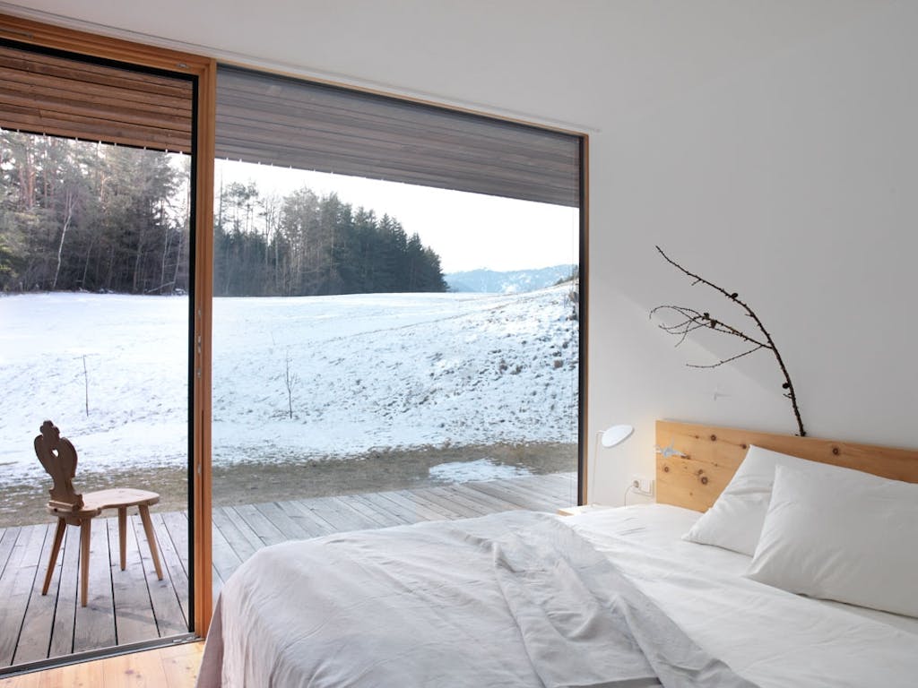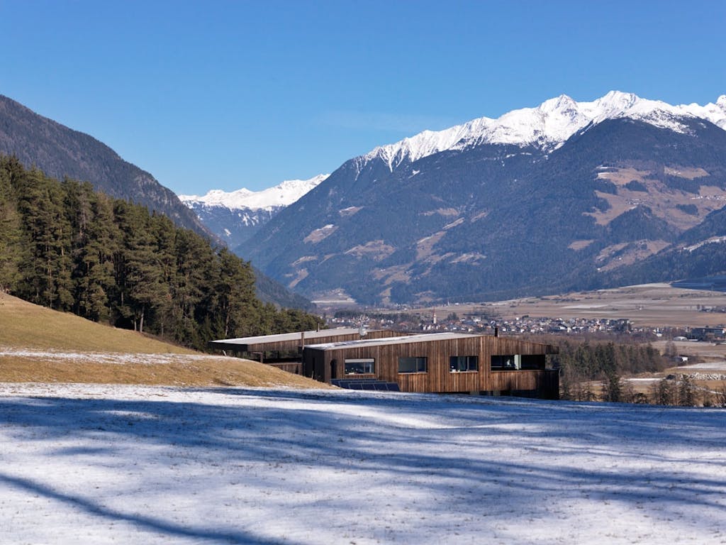 Den moderne gården driver med hester og dyrking av lokale urter, en geskjeft som ble startet av Mutschlechners mor – som også er eier av gården. De enkle, lave trebygningene ligger side om side, og smelter nærmest sammen med terrenget. Kjærligheten til naturen er tydelig i både materialer og fargevalg, og den stående trekledningen i lerk er hentet fra en dal i nærheten.