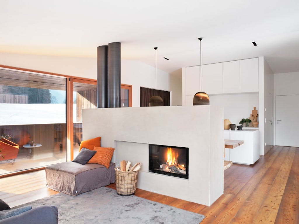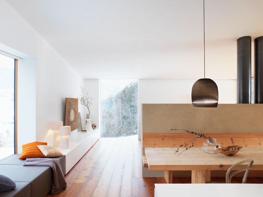 – Vi ville understreke den enkle designen i bygningen gjennom interiøret. Her er det rene linjer, hvite skap og dører, samt et langt, lavt benkeskap som går langs veggen i hele sitteområdet, forklarer arkitekten Verena Mutschlechner. Benkeskapet brukes både som sitteplass i vinduet, og som hvileplass for fine stilleben. De hvite lampene er Capodocia fra Arcade Avec.