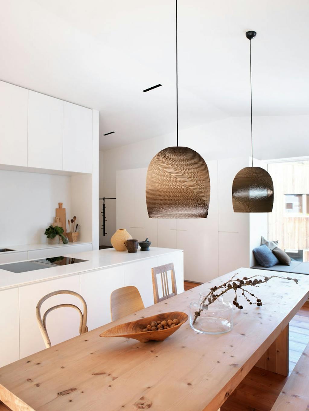 Hvite flater kombinert med ulike lokale tresorter gir et lyst og hyggelig hjem. Spisebordet i ubehandlet furu er tegnet av arkitekten og laget av en lokal håndverker. Rundt bordet står en miks av stoler, fra blant andre Gebr. Thonet Vienna og Muuto. Lampene, som er laget av papp, er fra Graypants.