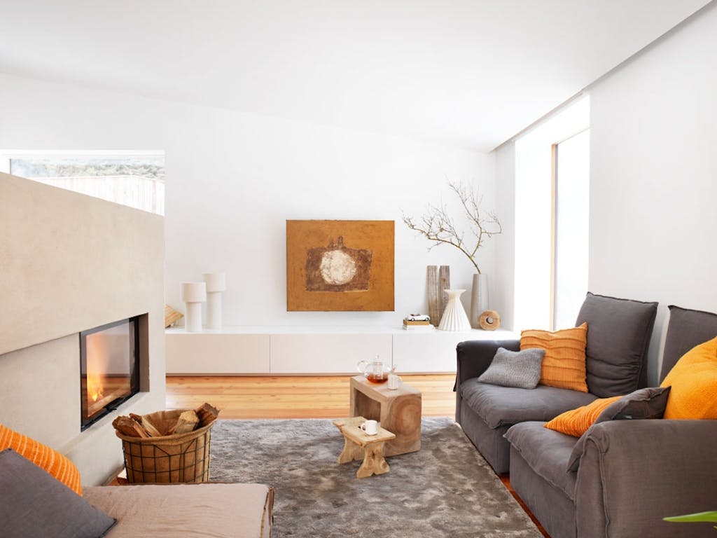En lav betongvegg med moderne peis skiller stueavdelingen fra kjøkken- og spiseområdet. Selve boligen har to etasjer, med en egen gjesteavdeling i kjelleren hvor eiernes voksne barn bor når de er på besøk. Den store puffen i stuen er fra Paola Navones Ghost-serie fra Gervasoni.