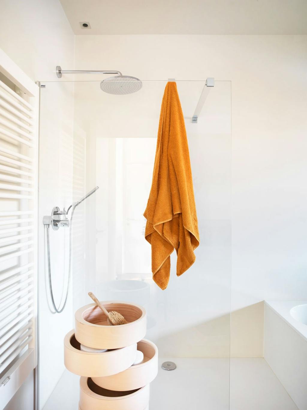 Badet byr også på mye lys og hvite flater i en ren og enkel design, med corian på både vegger og gulv. Det smarte oppbevaringsmøbelet er Bellovo fra Villa Home Collection.