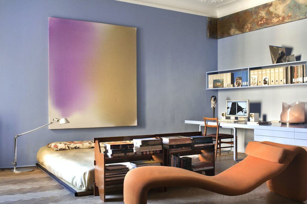 Det store maleriet av Mario Milizia er blikkfanget på soverommet. Det abstrakte, organiske formspråket plukkes opp av den buktende dagsengen designet av Olivier Mourgue for Airborn. Arbeidsbordet er malt i samme blånyanse som veggen, og tar på den måten mindre plass i rommet.