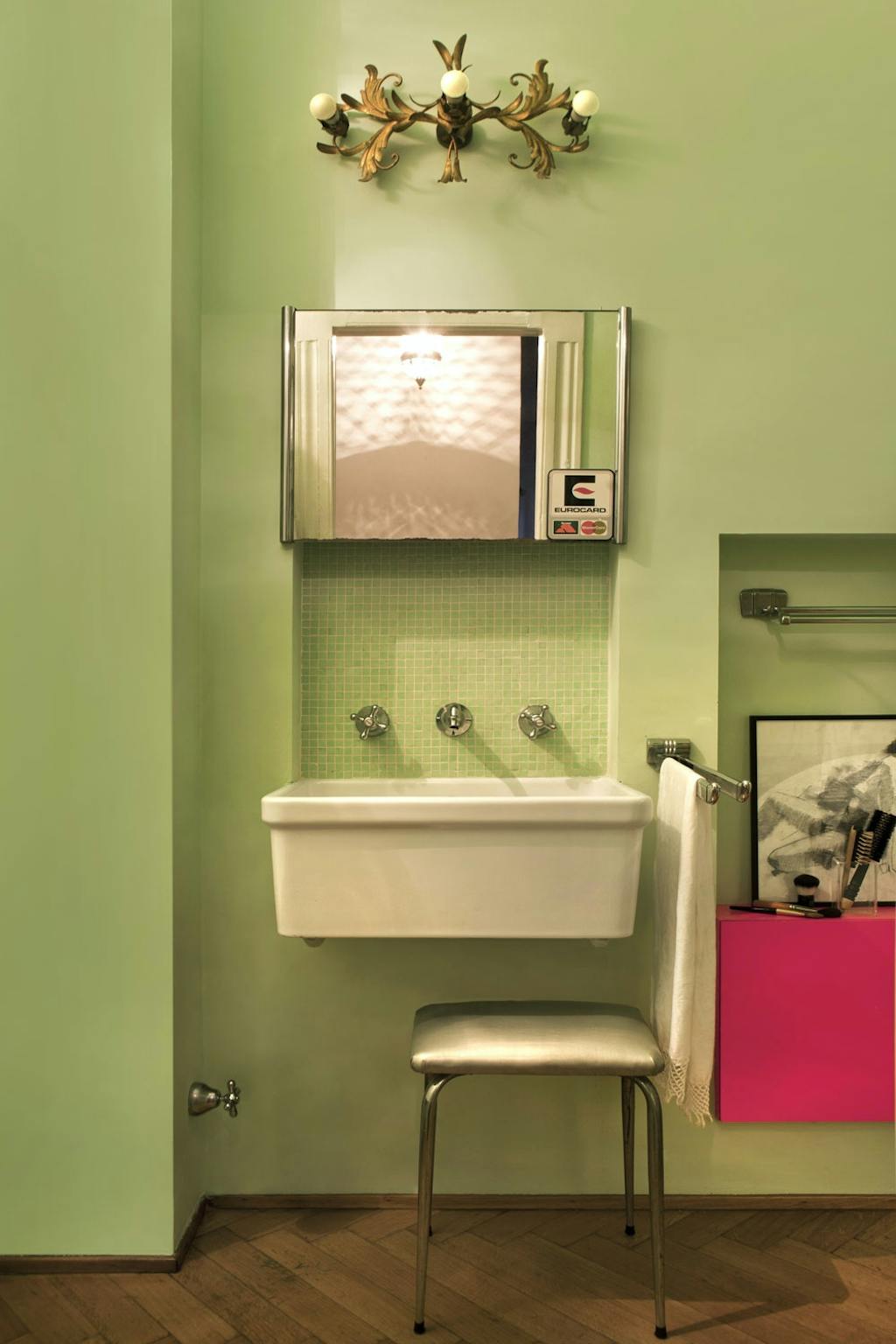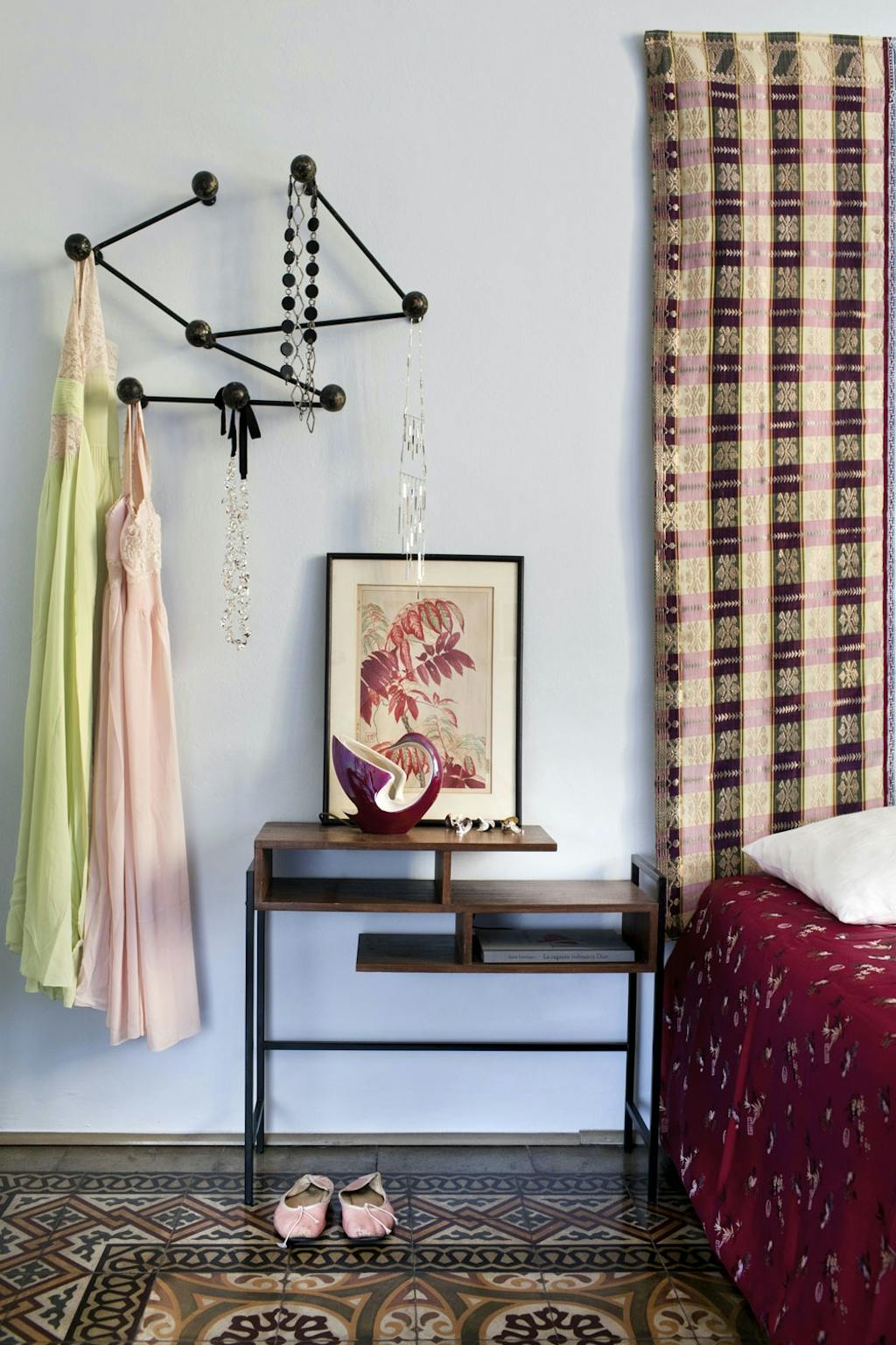 Klassiske detaljer og designmøbler med særpreg skaper en spennende dialog mellom fortid og nåtid, som gir Nathalies hjem en dynamisk helhet. Den gråmalte stripen på veggen er en smart måte å bryte opp den lange entreen på, mens speilet designet av Ettore Sottsass kaster et frekt rosa neonlys over det originale terrazzogulvet.