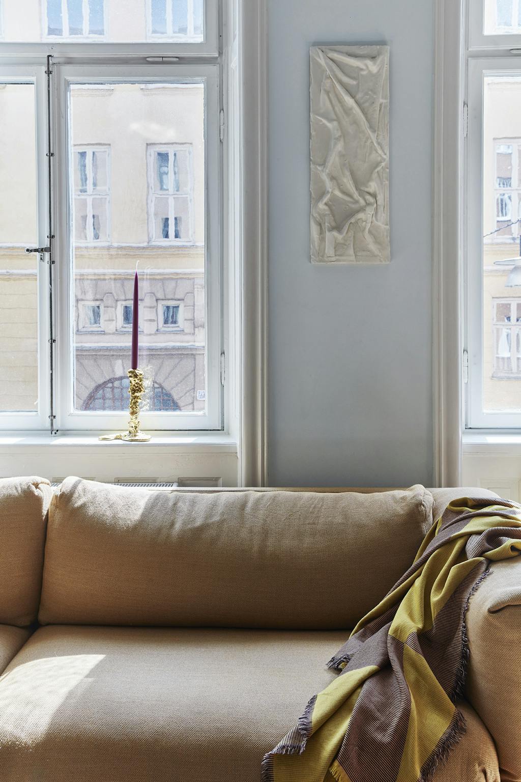 Av– Da vi kjøpte leiligheten høsten 2018, så den ganske kjedelig ut. Gjennom årenes løp hadde den blitt pusset opp flere ganger, men uten at det var tatt hensyn til verken huset eller leilighetens opprinnelige karakter fra 1906. Taket i entreen og det tidligere kjøkken var for eksempel senket 40 centimeter for å gi plass til spotter og ledninger, og et av rommene var blitt solgt til naboleiligheten, forteller Sophie Rockwell og Ludvig Marnell om hjemmet sitt på Södermalm i Stockholm.