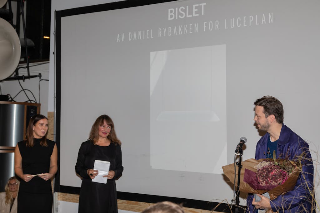 Programleder i Arkitektens hjem på NRK, Charlotte Thiis Evensen, delte ut prisen for Årets Lampe til Danuel Rybakken for Luceplan med lampen Bislet.