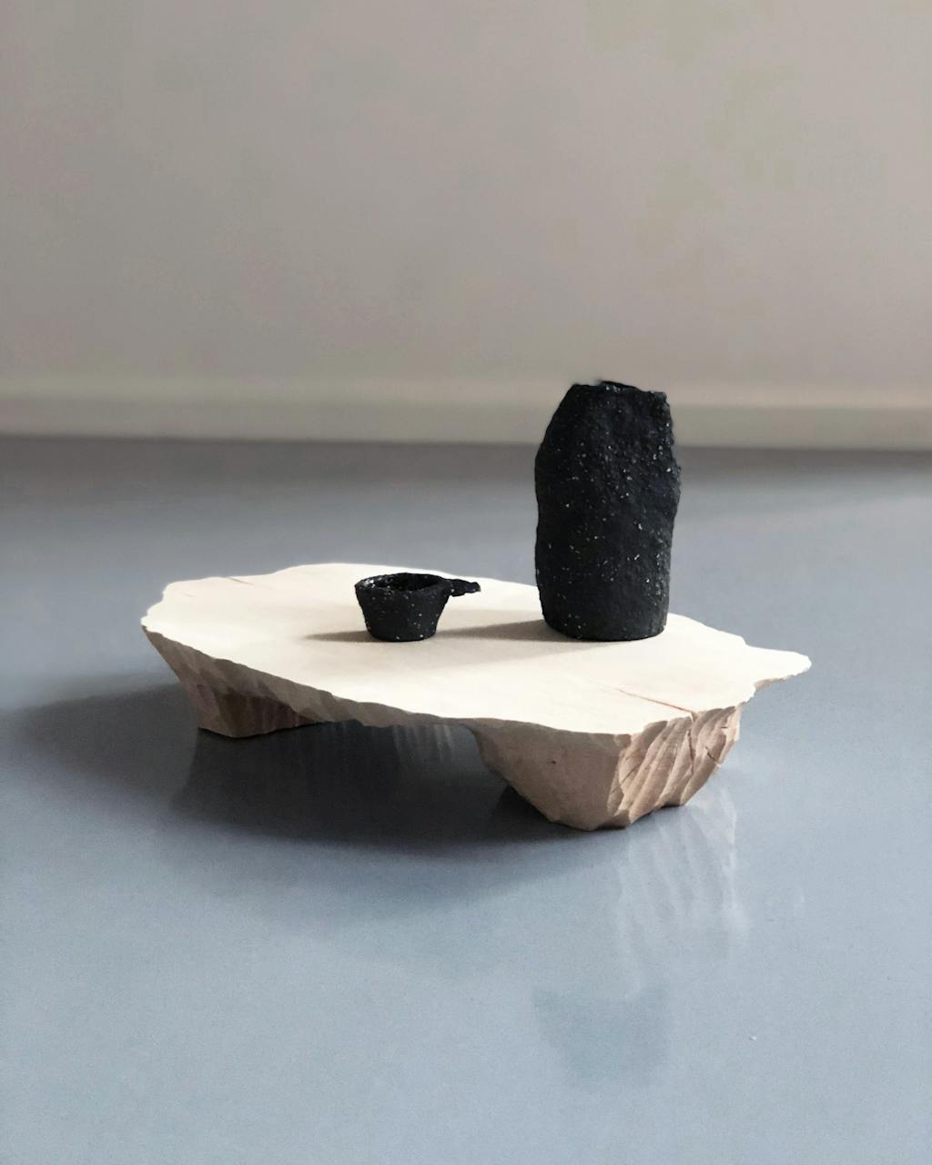 BRETTSPILL Fredrik Bull har leika seg med motorsag på ein bjørkestamme for å lage eit japanskinspirert brett. Saman med sakesettet i keramikk fascinerer formspråket hans meg.