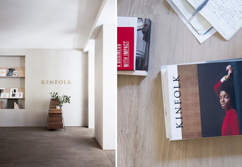 Interiøret er minimalistisk og fargepaletten er holdt naturlig, for å samsvare med Kinfolks kjerneverdier. Veggene har japansk inspirasjon, hentet fra den såkalte wabi-sabi-estetikken. Den handler mye om å se det vakre i det uperfekte.