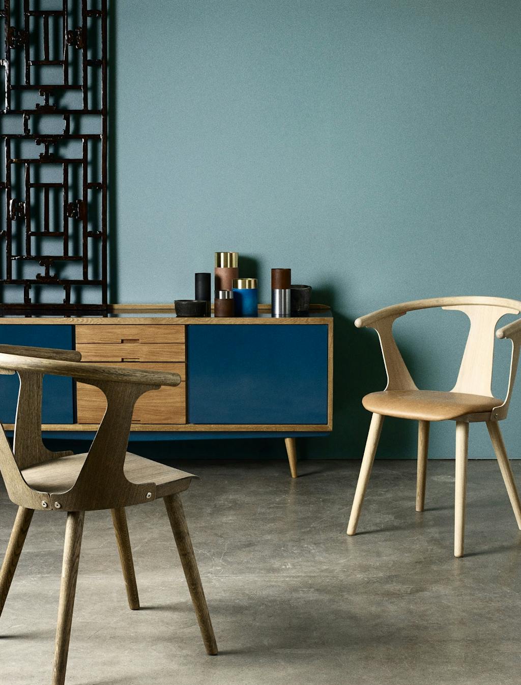 Spisebord, 6284, 22 096 kr, stol med ullsete, Søborg, 4231 kr, begge designet av Børge Mogensen, lyseblå stol, Pato, design Welling/Ludvik, 1499 kr, alt fra Fredericia Furniture, grå stol, Syveren, design Arne Jacobsen, 3824 kr, Fritz Hansen, stol med skinnsete, CH 33, design Hans J. Wegner, 6588 kr, Carl Hansen & Søn. Steinfat, 626 kr, keramikkskål, 434 kr, begge fra Studio Oliver Gustav, vase, 3099 kr, klassik.dk.