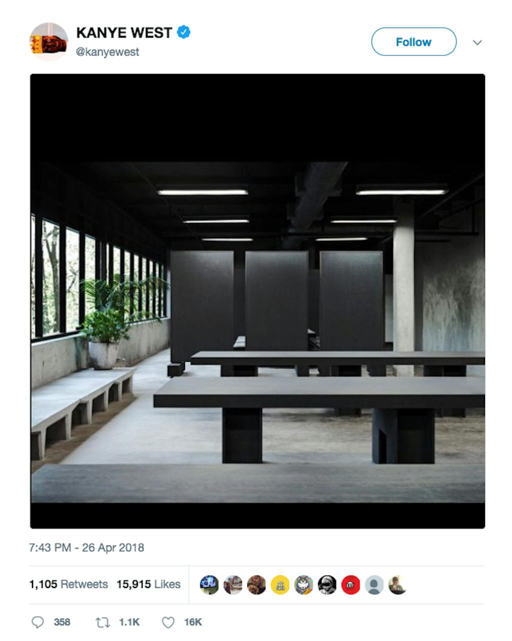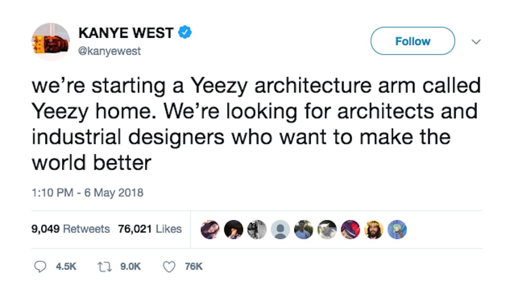 - Vi søker arkitekter som vil gjøre verden til et bedre sted, twitret Kanye West forleden.