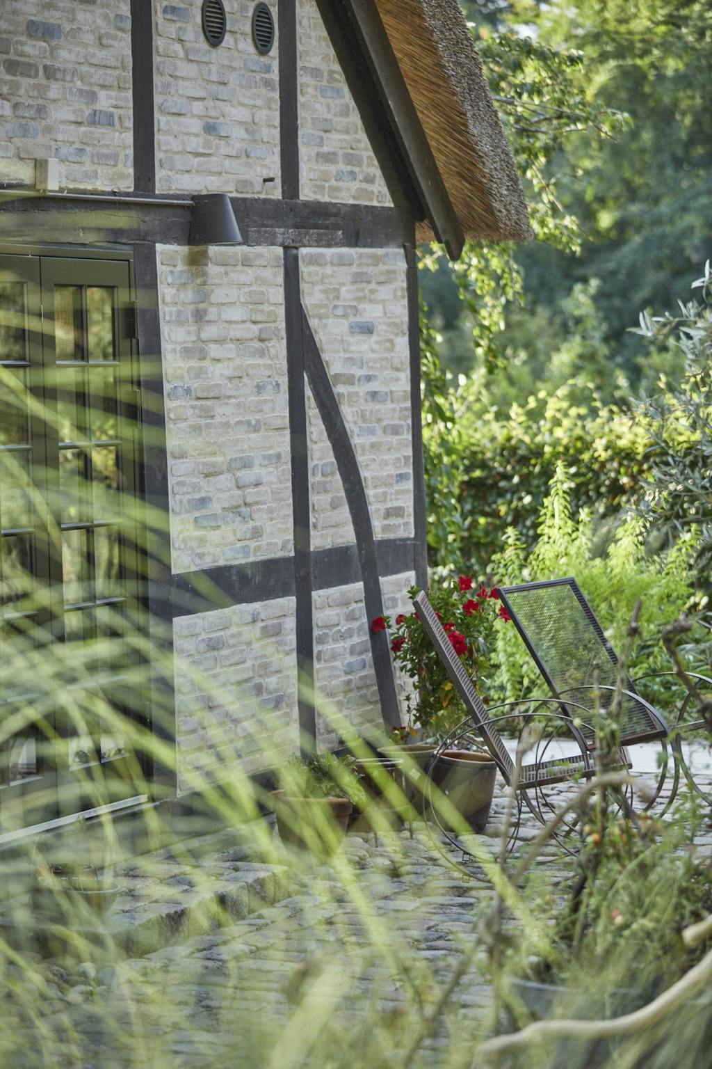 For Anja og Martin var det viktig å bevare husets historie da de skulle velge belegningsstein. Valget falt derfor naturlig på klassiske dekorsteiner og brostein, som de kombinerte med gotlandsk kalkstein. Denne steinen har en vannabsorbsjonsevne på 0,2 prosent, noe som gjør at den tåler å være ute i det danske klimaet. En slik eksklusiv stein kan ved første øyekast virke malplassert ved et beskjedent hus, men paret fant eksempler på at de tidligere beboerne hadde hatt kontakt med folk fra de omkringliggende herregårdene. Derfor kunne de forsvare å supplere med kalkstein, som både passer godt sammen med de andre steinene og er svært behagelige å gå på. Gotlandsk kalkstein er kostbart, men Anja var heldig og fant et restparti på 200 m² på Den Blå Avis (Danmarks svar på Finn) etter renoveringen av Rødovre rådhus – og slo til umiddelbart.