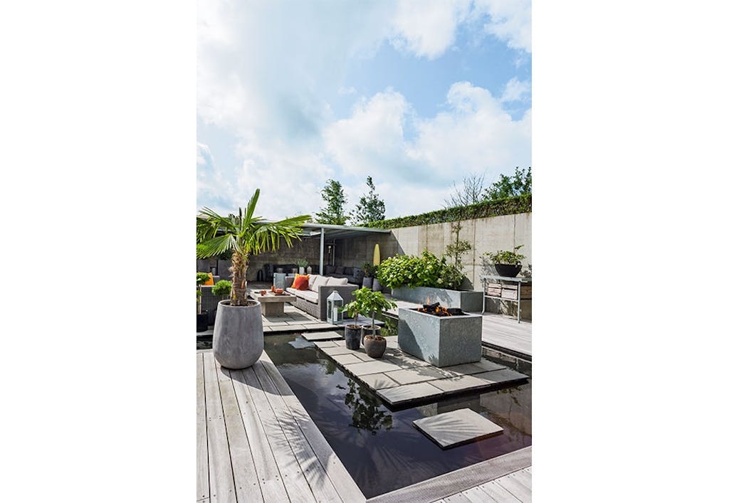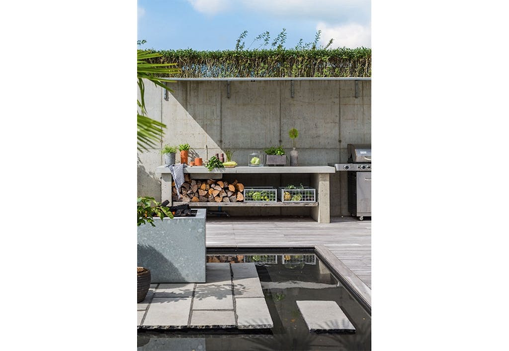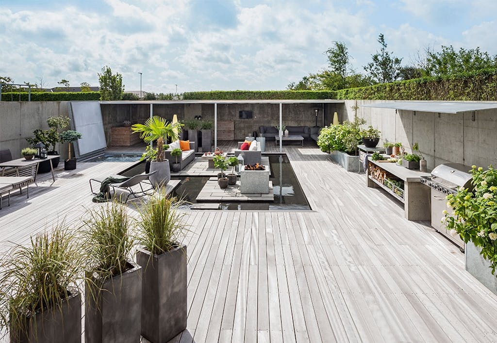 Slik kan hverdagsluksus se ut: Et nedsunket hagerom rammet inn i rå betong, med smarte løsninger som gjør det enkelt å nyte livet ute. Her går ikke dyrebar tid bort til vedlikehold, hagearbeid eller store forberedelser før man kan finne seg til rette.