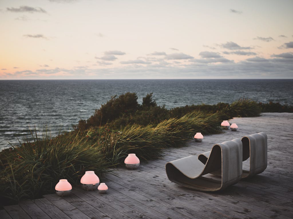Må sommerkveldene vare evig! Lyktene Henning Koppel Hurricane i rustfritt stål og glass er designet for å brukes både inne og ute. Fra 629 kr, Georg Jensen.