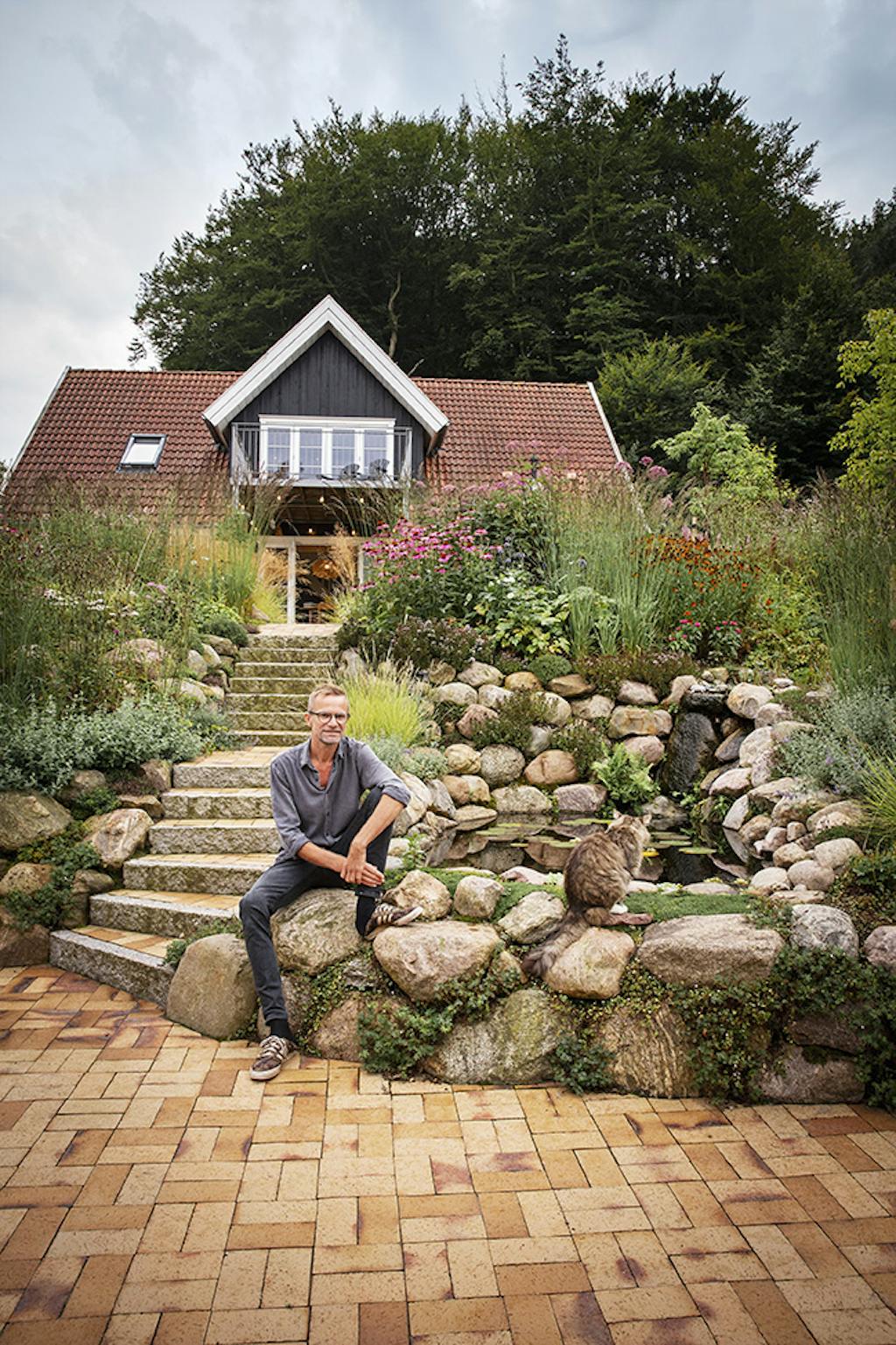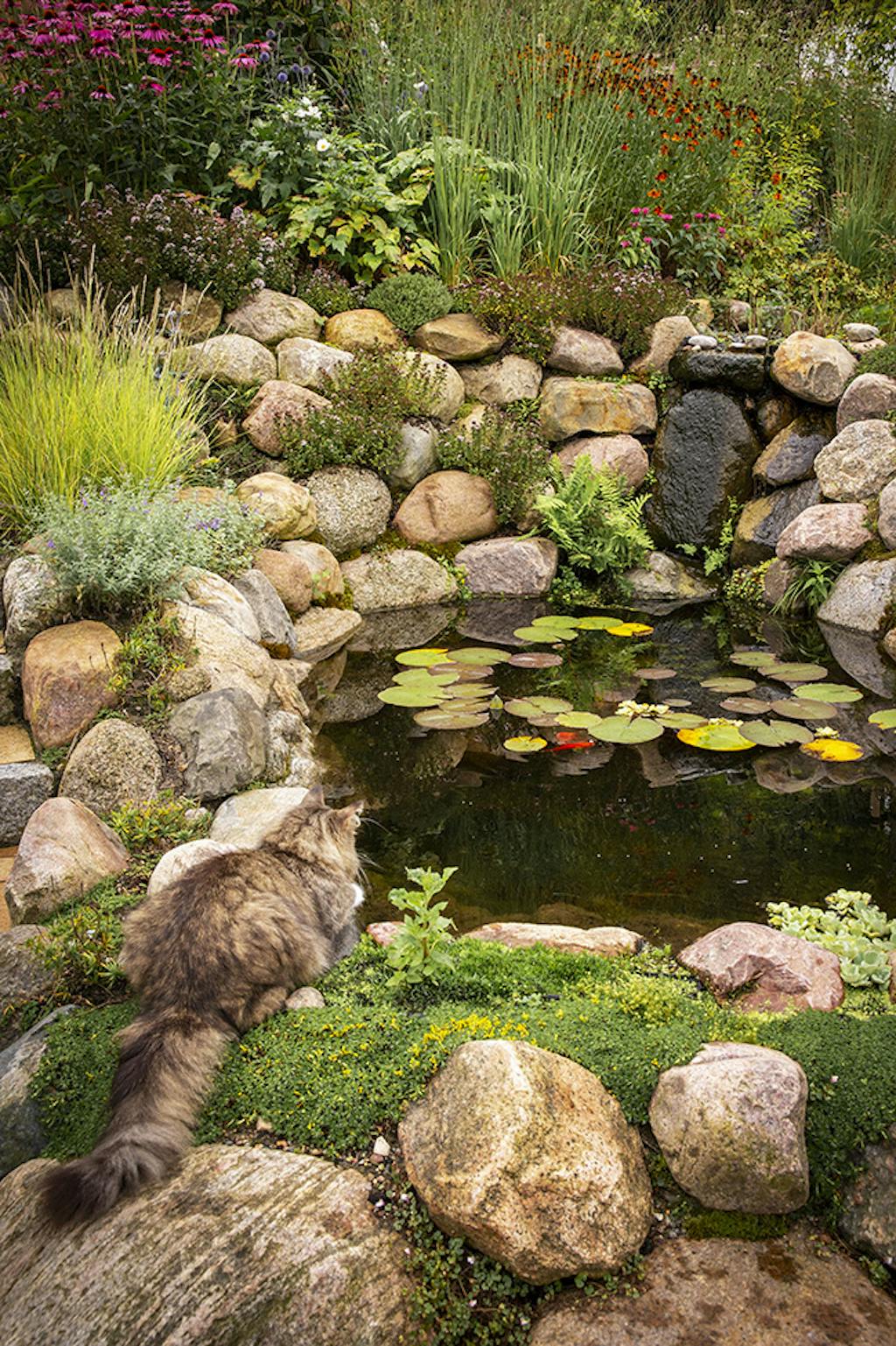 På det midterste nivået i hagen ligger hagedammen. Kantene er satt med steiner som er funnet på tomten. Katten Kingo ligger på lur for å se om det er koikarpe til lunsj. I hagedammen vokser det nøkkeroser, og Niels har plantet mange alpine planter, bregner og stauder mellom steinene for å få et naturlig uttrykk.
