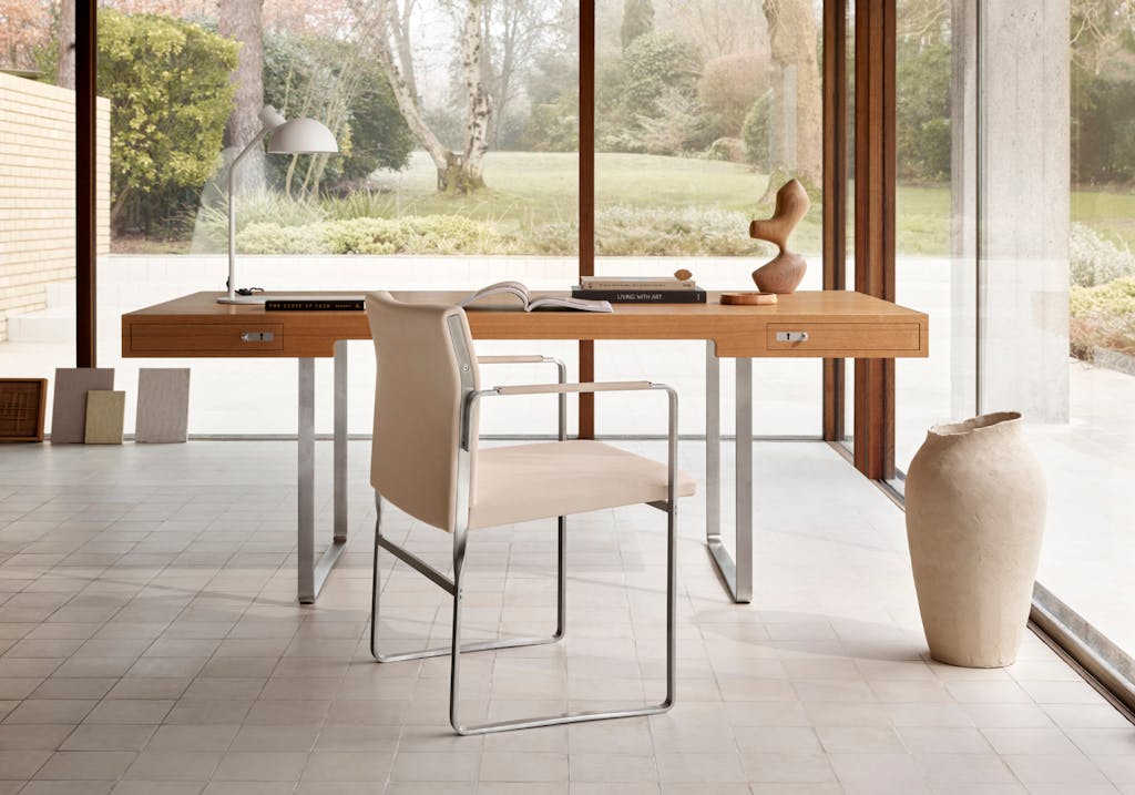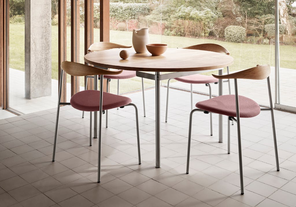 Wegner designet ikke bare stoler, og dette spisebordet er et bevis på at han kunne gjøre mye mer. Den runde bordplaten i tre og bukkebeina i stål gir bordet en gjennomtenkt komposisjon som absolutt fortsatt er moderne i dag, selv om bordet opprinnelig ble designet i en seksseterversjon i 1962.