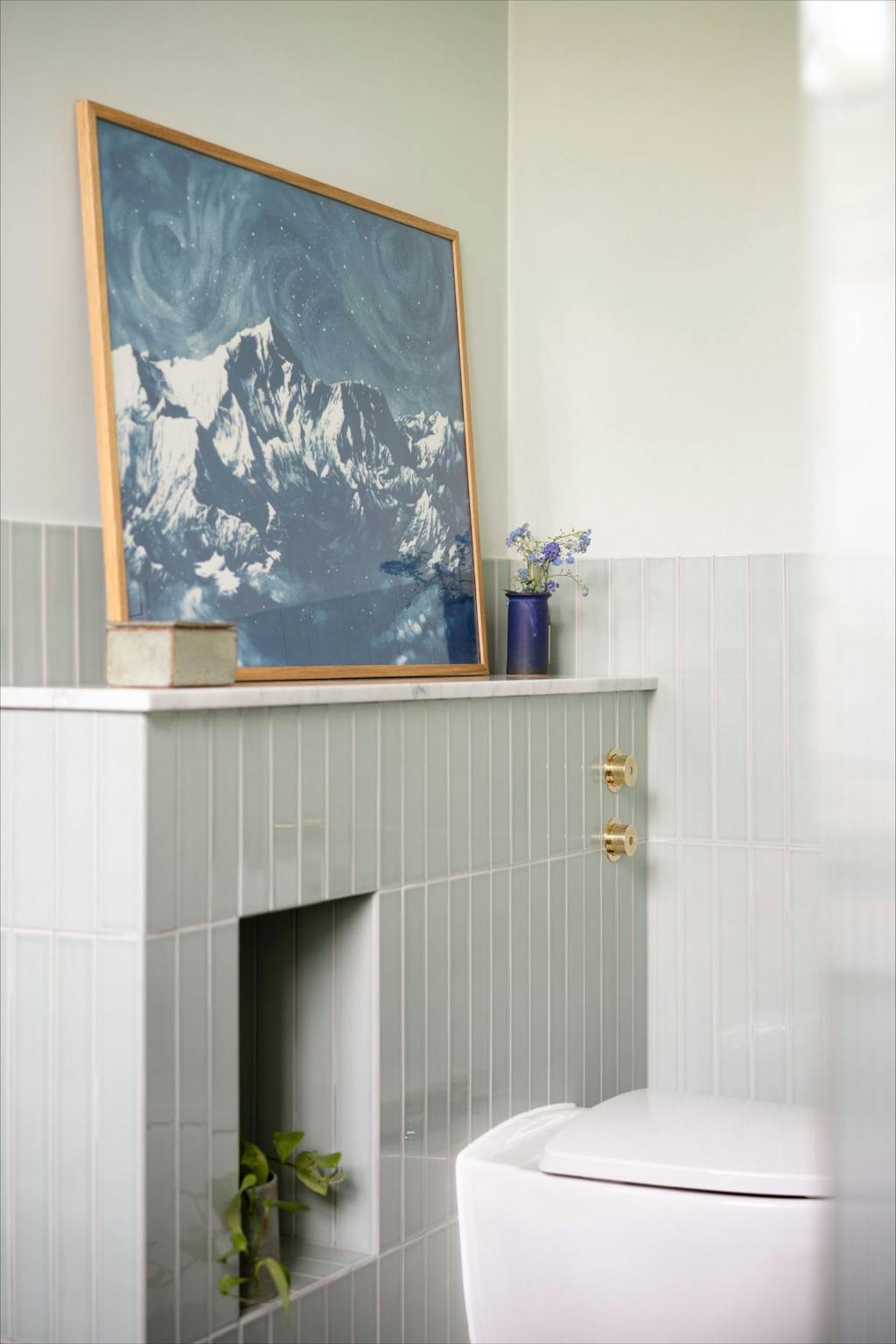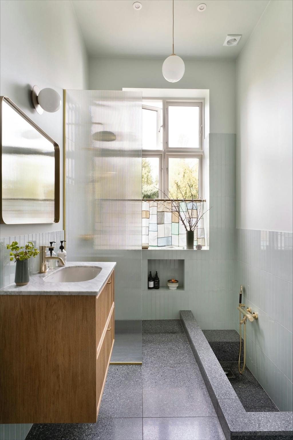 Tidligere lå det terrazzo både på gulvet og badekaret – det gjør det fremdeles, men nå i en mørkere variant med grønne spetter. Fargen i de mintgrønne veggflisene er hentet fra den nye terrazzoen. Der toalettet nå henger, var det tidligere en vask, og der dusjen står i dag, var toalettet.