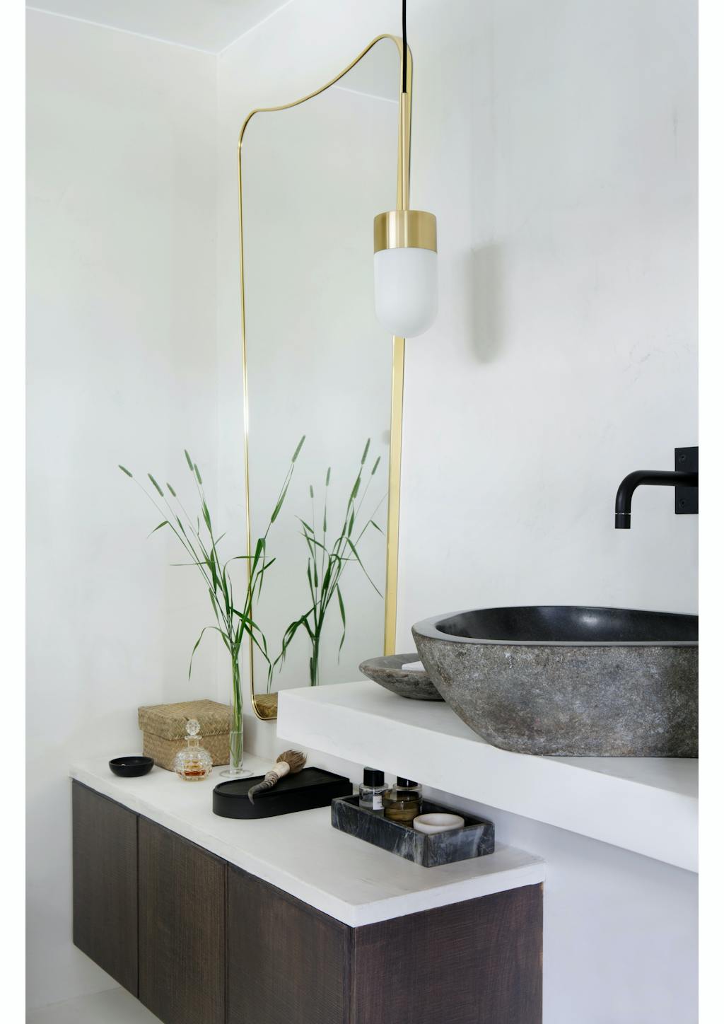 Anne Lene ønsket seg følelsen av et tyrkisk bad. R__øffe materialer som mikrosement, stein og treverk, kombinert med den glamorøse, gylne messingen, har gitt henne drømmebadet. __Kurver og deilige håndklær fra Granit hjelper til. Den hvite skålen er fra Lynby Porcelæn, kjøpt hos Houz.