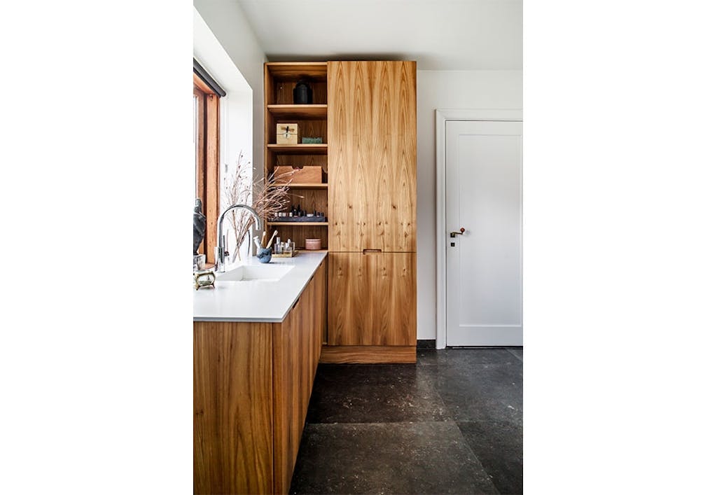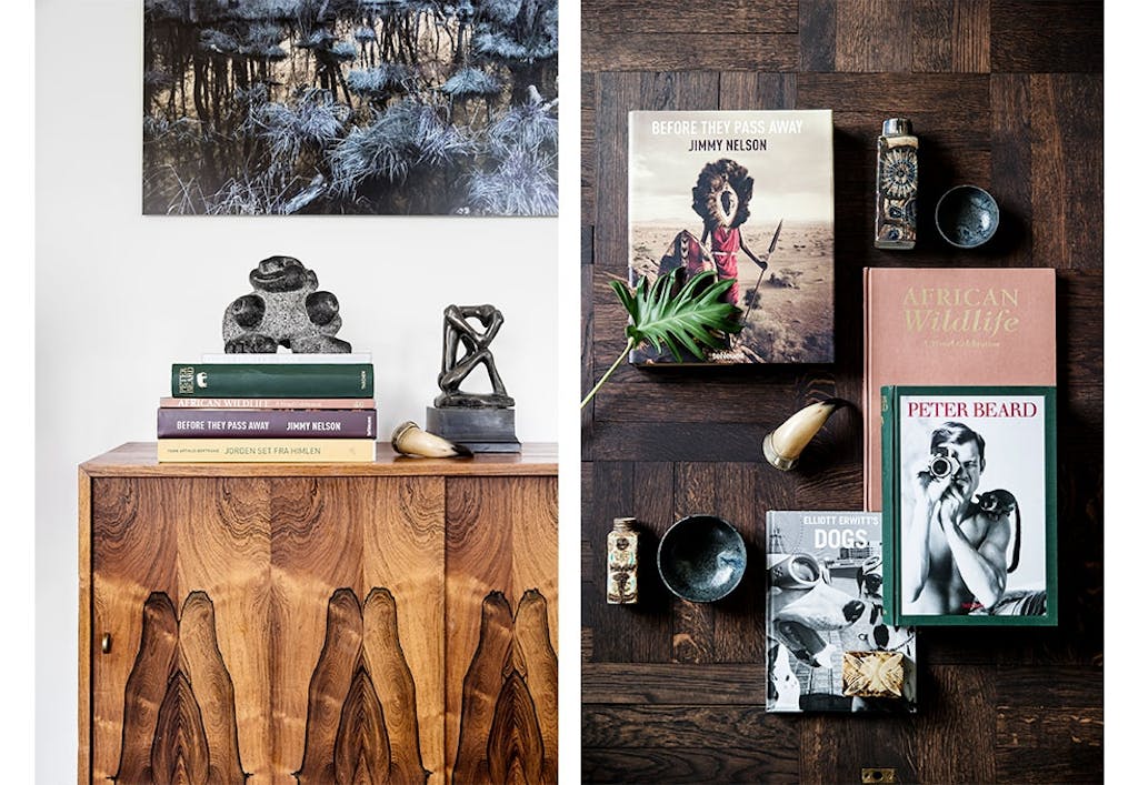 De opprinnelige blomsterkassene i vinduene, tidstypisk for modernistiske hus som dette, er ved hjelp av Frederiksberg Møbelsnedkeri gjort om til radiatorskjulere og dermed også en dypere vinduskarm. Disse er selvfølgelig farget i en rødlig tone, som de originale teakkarmene i hjemmet. Hans J. Wegners Flaglinestol fra PP Møbler, designet i 1950, kler omgivelsene godt – og vice versa.
