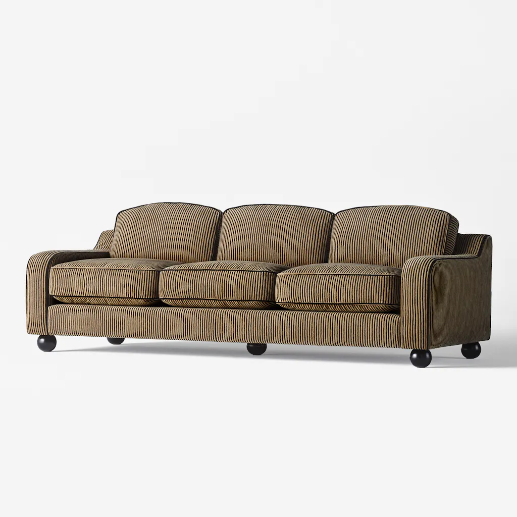 De mønstrete sofaene er på vei inn for fullt – og jeg elsker det. Denne varianten fra Dusty Deco i litt grovt materiale med striper har fanget min oppmerksomhet. Kuleføttene er prikken over i-en.