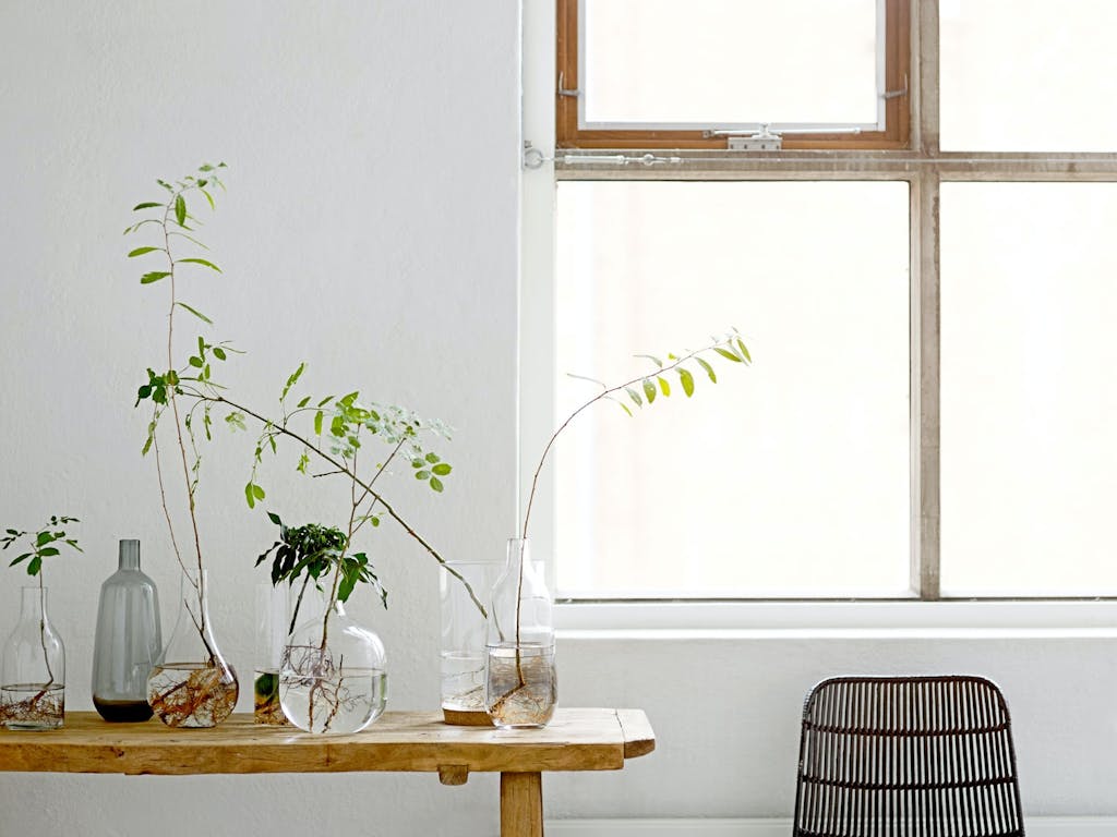 Samle ulike vaser – ulike størrelser, ulike former, ulike materialer – i små stemningsskapende stilleben. Slik har du noe vakkert å se på, selv når vasene står tomme. Disse er fra House Doctor.