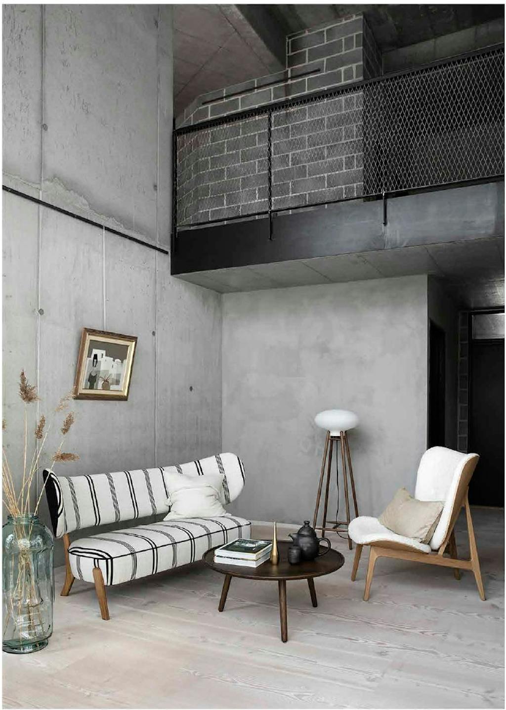 Sofa med understell i heltre eik, TMBO, design Magnus Læssøe Stephensen i 1935, fra 22 471 kr, Mazo. Sofabord i røkt eik, Pepples, 4483 kr, Alton & Heim. Lenestol i FSC-sertifisert eik, Elephant, design Kristian Sofus Hansen og Tommy Hyldahl, 19 262 kr, Norr11. Gulvlampe i munnblåst opalglass og ben