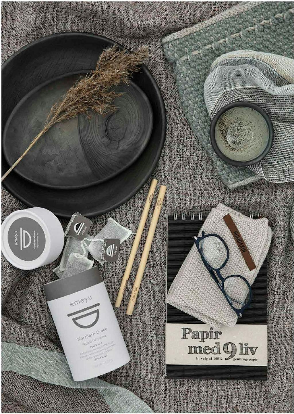 i FSC-sertifisert valnøtt, U5 Hiti, design Philip Bro og Dögg Guðmundsdóttir, 3852 kr, FDB Møbler. Håndlaget vase i gjenbruksglass, Mr. Big, 1220 kr, vintage oljemaleri av Fabian Lundqvist, 3847 kr, begge fra yumecph.com. Bordlighter i børstet messing, Sculpture, 769 kr, Mignis. Økologisk produsert keramikk i svart, tekanne, 771 kr, kopp, 193 kr, naturebyhand.dk. Hvit pute i lamaull, Far- go, 1295 kr, beige pute i organisk bomull, Velvet, 645 kr, begge fra Aiayu.