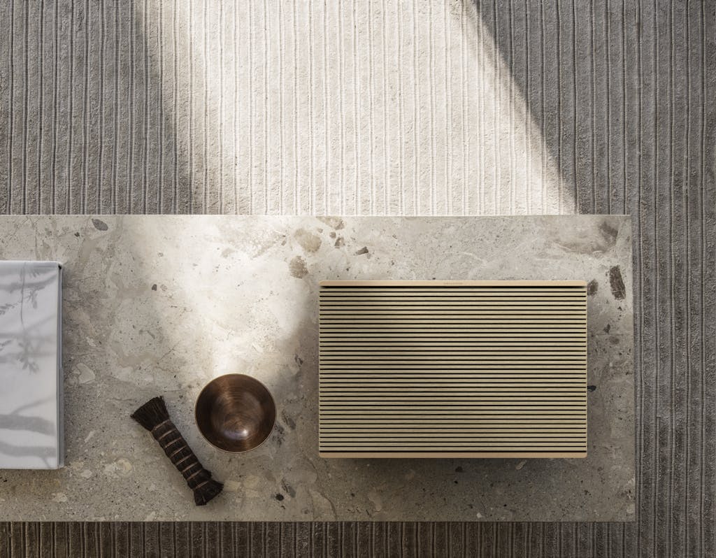 Den klassiske Beoplay A9 høyttaleren til Bang & Olufsen er for første gang laget i en versjon av perleblåst aluminium. Aluminiumringen, med sin ikoniske sirkulære form, fremheves av en polert overflate. Det vevde stoffdekselet fra Kvadrat, i varme fargetoner, står i kontrast til de kjøligere tonene i aluminiumet.