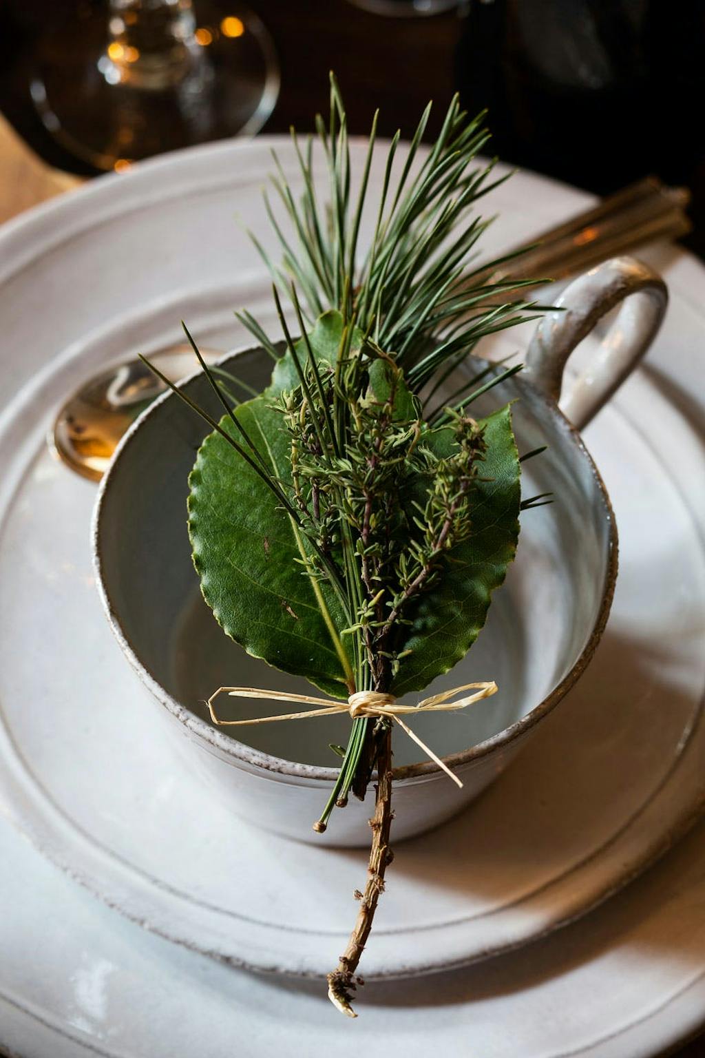 Dropp den pompøse bord-pynten, plukk i stedet med deg det du finner på skogturen. En barkvist, et blad og et par stengler med en velduftende urt, mer skal det ikke til før du har en dekorativ kuvert til gjesten. Duften av natur og jul følger med på kjøpet!