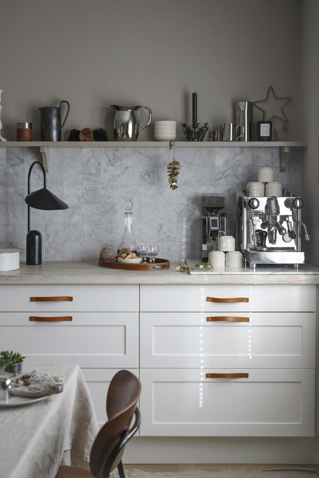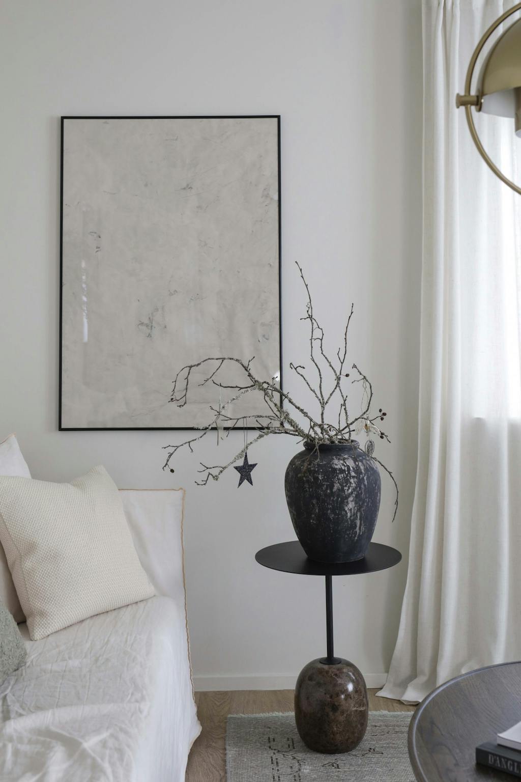 Bildet å veggen er malt av fotografen. Sidebordet Lato er fra &Tradition. Keramikkvasen har Gry pyntet med greiner fra hagen og en papirstjerne fra Nordstjerne.
